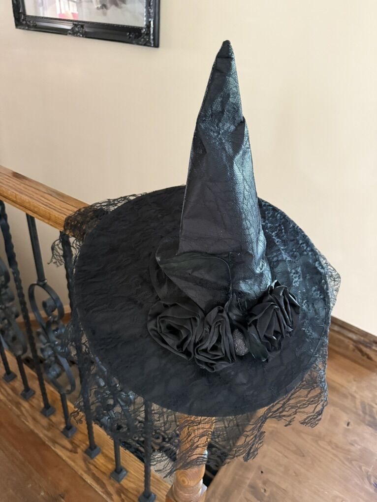 Deluxe black witch hat with lace one size