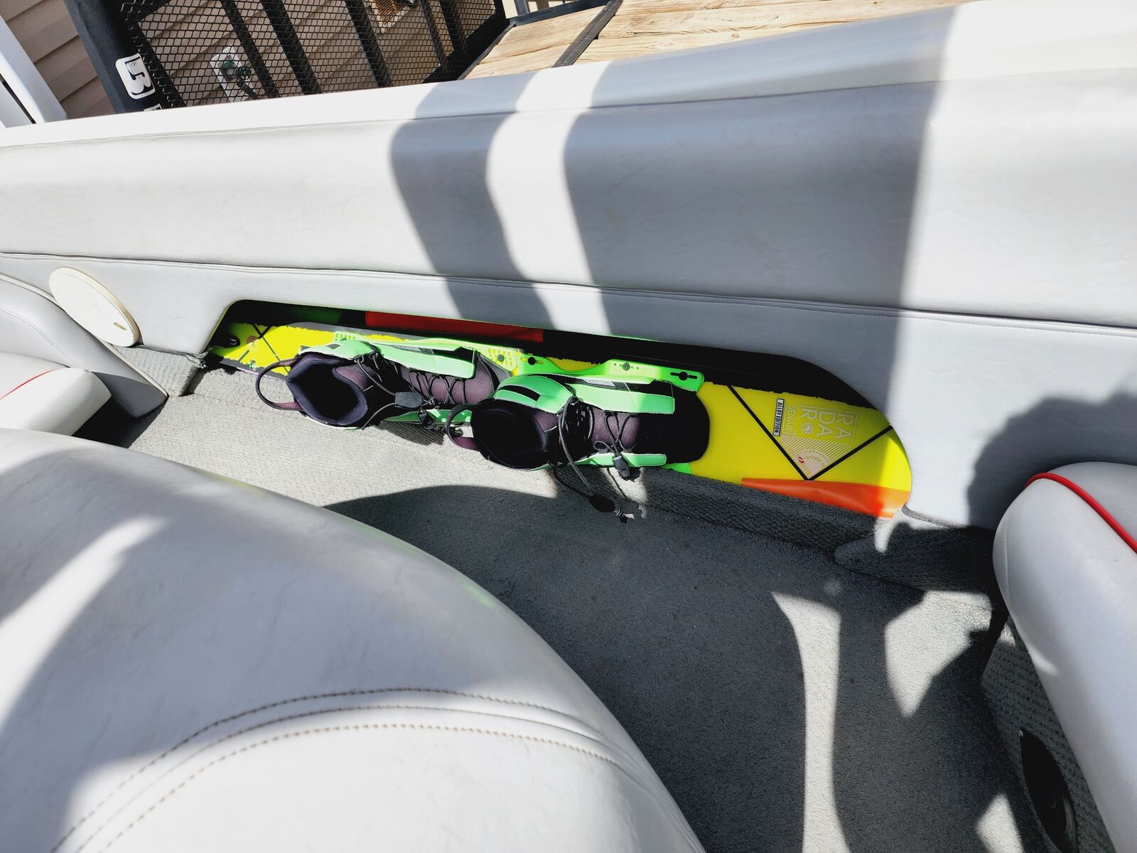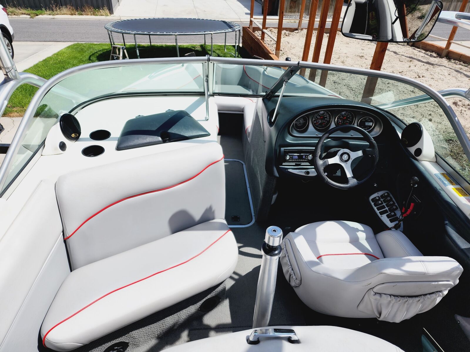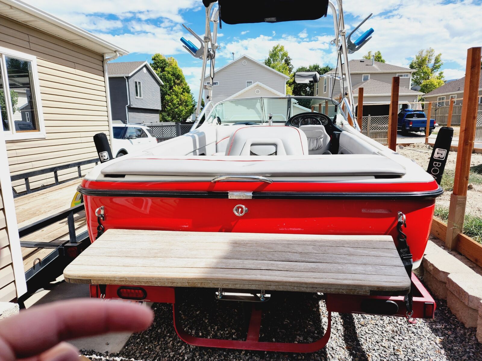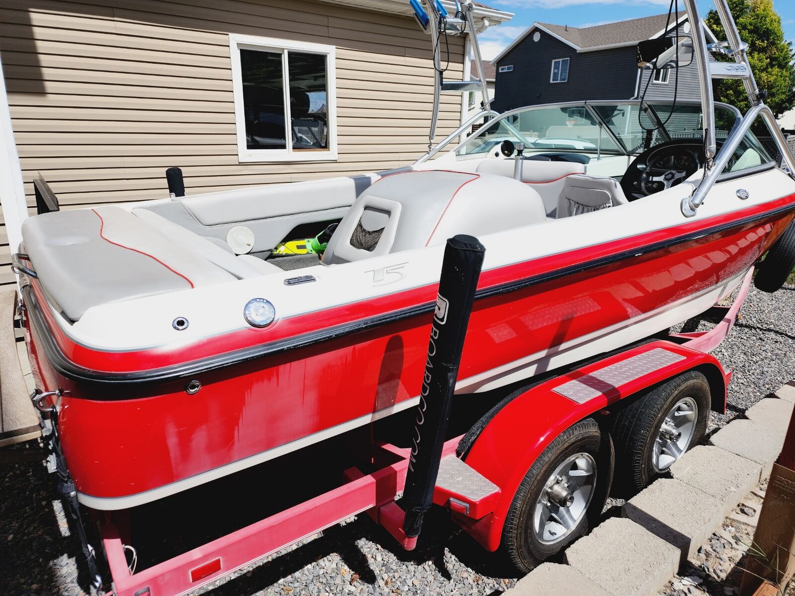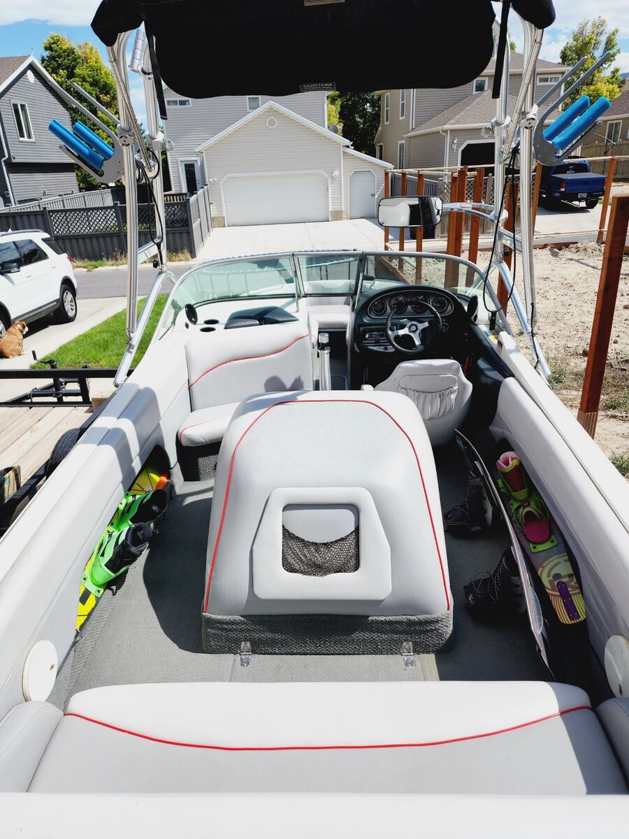 Trailer paint has faded a little but trailer still is excellent condition. Fenders have been repainted. Has awesome sound system with tower speakers. 1 amp and 12" sub. 300 lbs fat sack in the rear compartment with auto fill and empty. Bimini cover, full travel cover, bow cover, teak deck cover, tower speaker cover as well. Comes with 2 props(cruising prop, slalom prop) and weekend savor storage bag with prop change tool kit and harmonic removal tool($1,000 value)