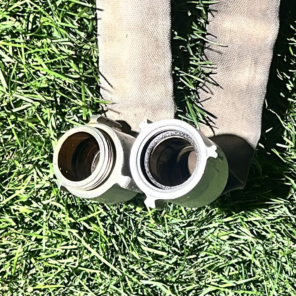 Double jacket fire hose with female-male fittings and a water pressure capacity up to 250 psi. The couplings are in working order and there are no visible holes. Text preferred or leave a voicemail and I’ll get back to you.
