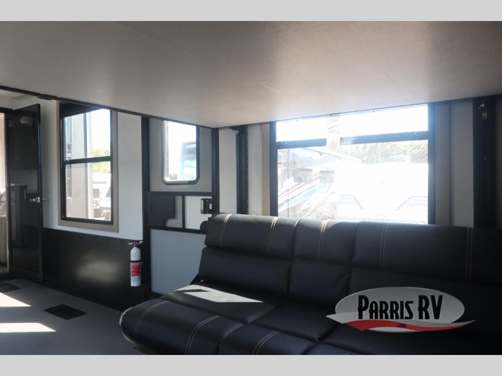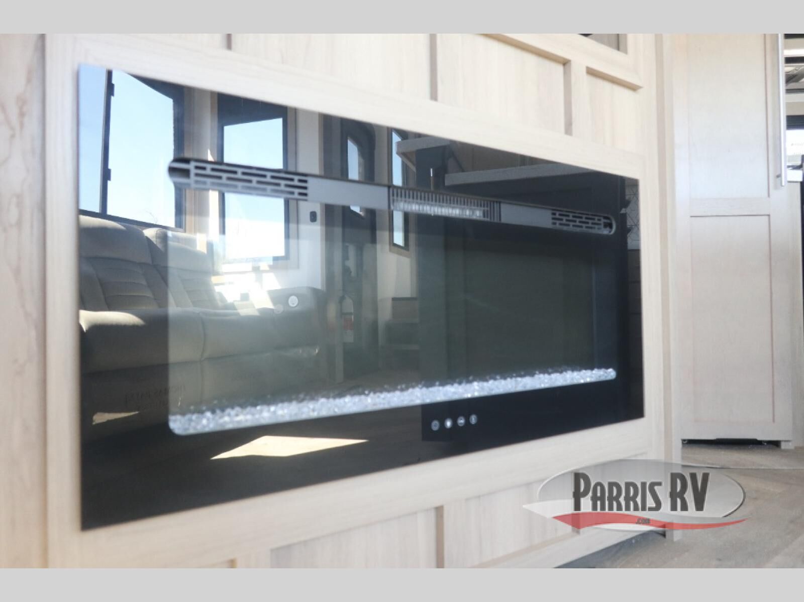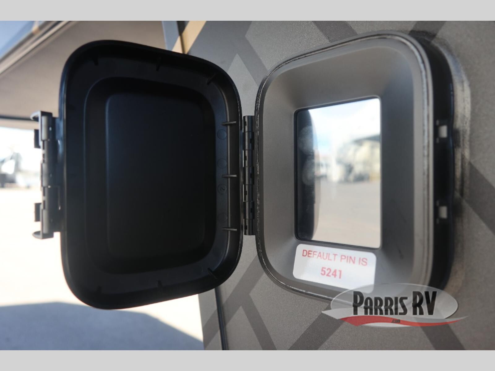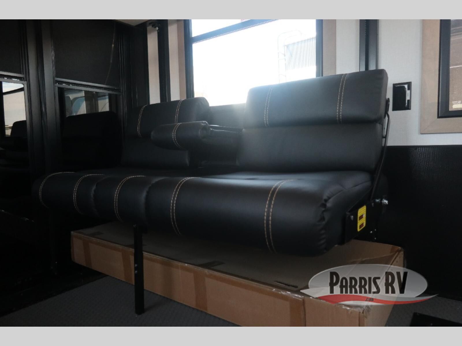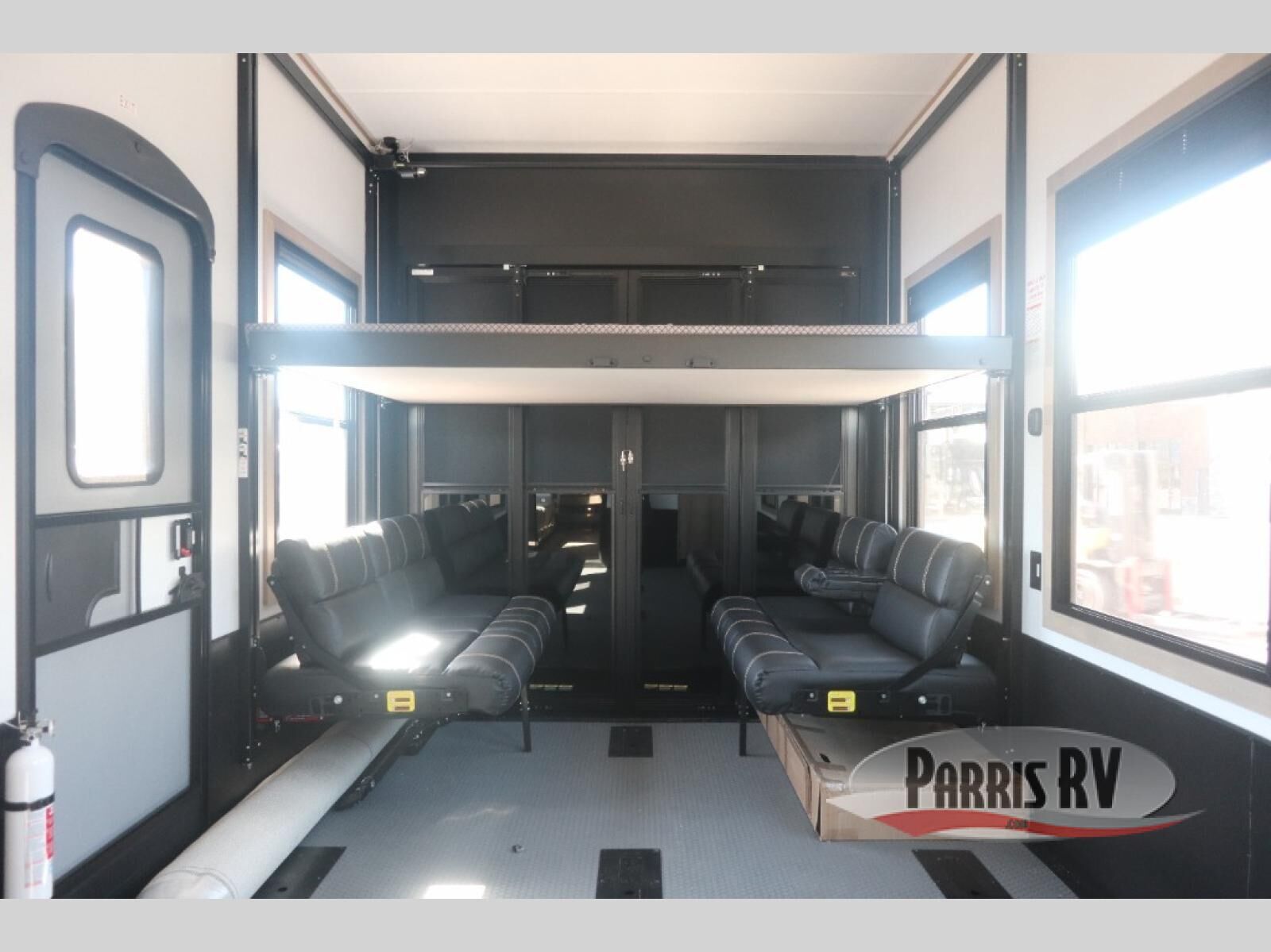 You will have everything you need for a comfortable camping trip and then some with this toy hauler! Load your toys into the 16' garage area with the Lippert Power Play motorized ramp door and secure them with 5,000 lb. frame welded tie-downs. The garage also has an electric bed above dual opposing sofas with a loft with a twin bed and a half bathroom. Create your best meals with the four-burner cooktop and enjoy the company of others sitting at the kitchen island with three bar stools while you prepare it. Relax in true comfort on the 4-seat recliner across from the entertainment center with a fireplace. When you're ready to wind down your nights, take a hot shower in the full bathroom then head directly into the front private bedroom which features a king bed suite with a large front wardrobe for clothing storage, and washer/dryer prep in case you wish to add appliances so you can wash your clothes while you are away!
