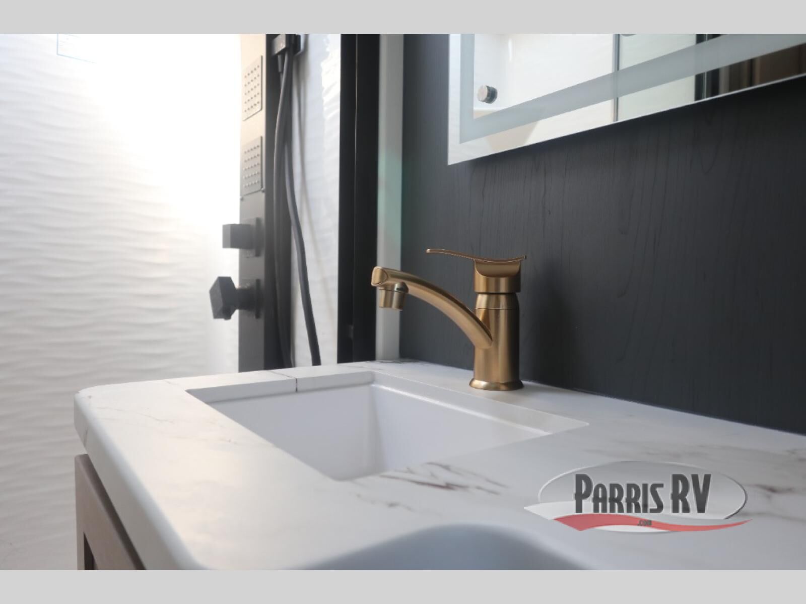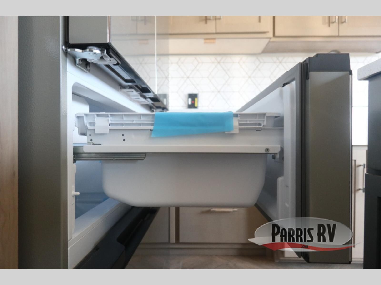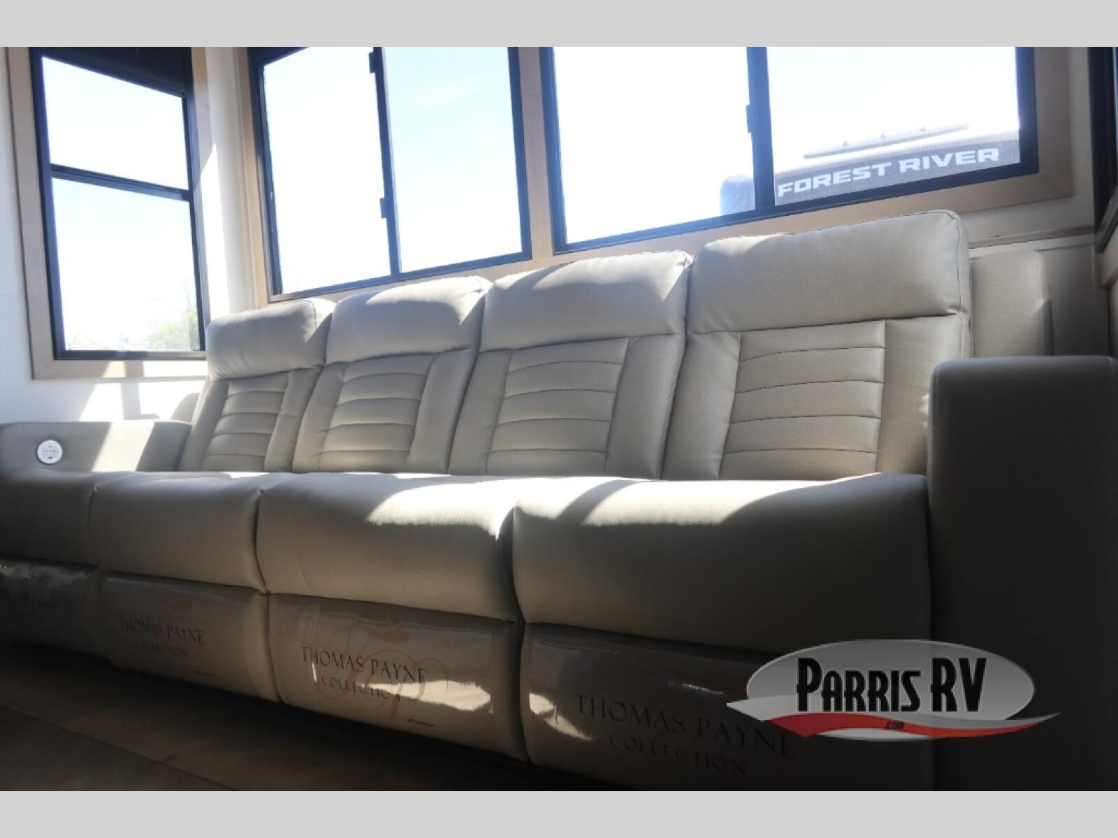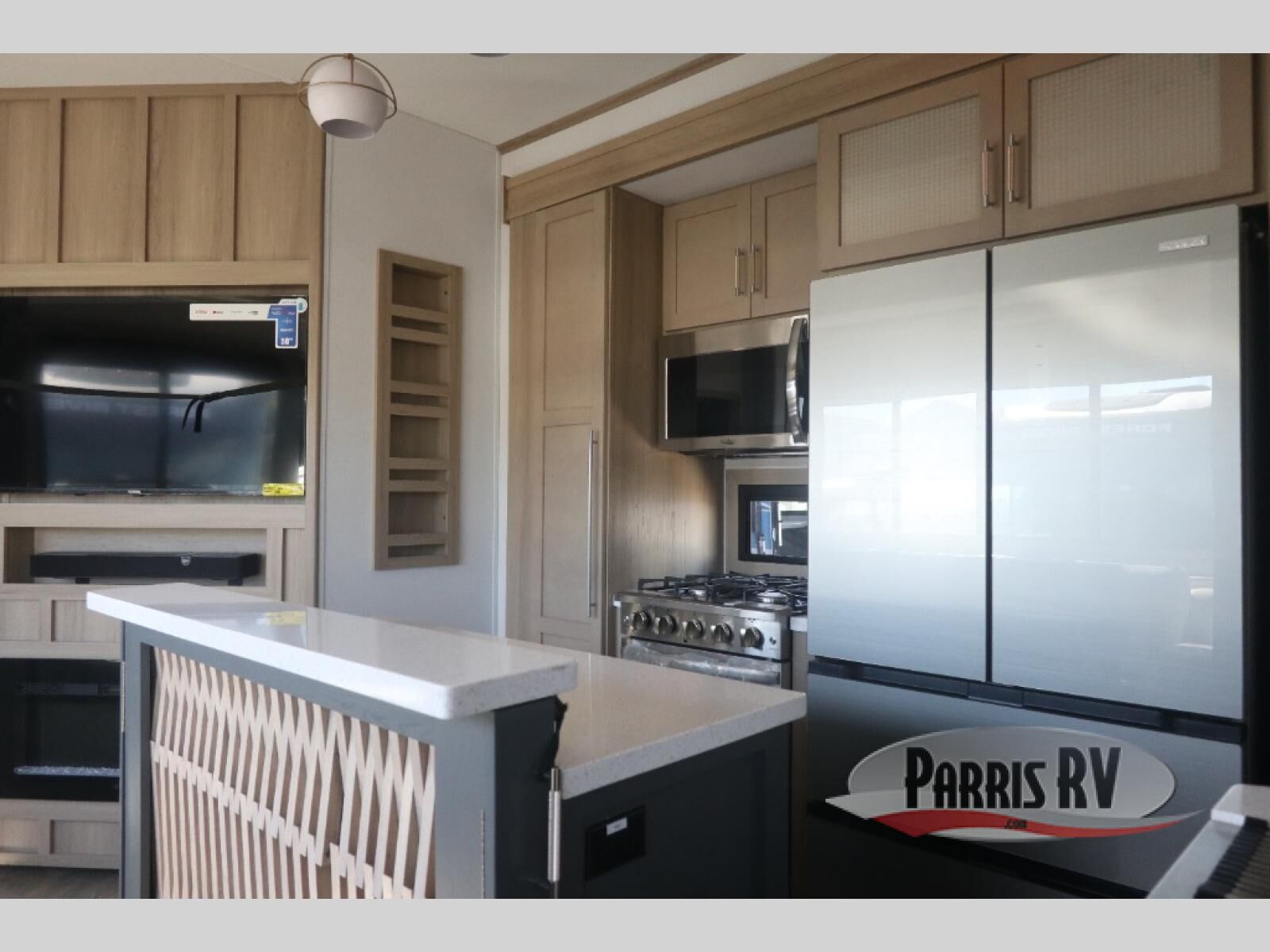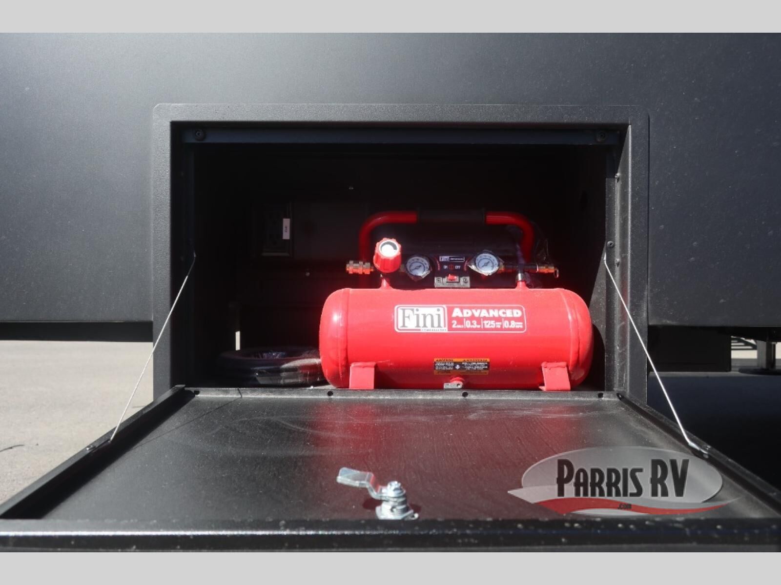 You will have everything you need for a comfortable camping trip and then some with this toy hauler! Load your toys into the 16' garage area with the Lippert Power Play motorized ramp door and secure them with 5,000 lb. frame welded tie-downs. The garage also has an electric bed above dual opposing sofas with a loft with a twin bed and a half bathroom. Create your best meals with the four-burner cooktop and enjoy the company of others sitting at the kitchen island with three bar stools while you prepare it. Relax in true comfort on the 4-seat recliner across from the entertainment center with a fireplace. When you're ready to wind down your nights, take a hot shower in the full bathroom then head directly into the front private bedroom which features a king bed suite with a large front wardrobe for clothing storage, and washer/dryer prep in case you wish to add appliances so you can wash your clothes while you are away!