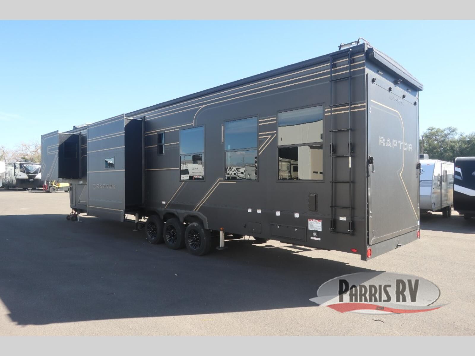 Experience a breath of fresh air with one of these Keystone RV Raptor fifth wheel toy haulers! Their rugged construction consists of a one-piece Alpha Super Flex TPO roof membrane, Dyna Span floor decking, and 5,000 lb. frame-welded tie- downs to keep your toys in place as you travel. Some unexpected conveniences you will appreciate include an Omni-Chill A/C system to keep you cool on those hot summer days, a Furrion backup camera, MaxTurnTM technology with a HeluxTM pin box, and a Generation 3 iN-Command smart automation system with Global Connect to make life easier. There is also designer style vinyl flooring throughout, along with new ceiling treatment with LED accent lighting, beach wood and white cabinetry, and many more interior comforts!