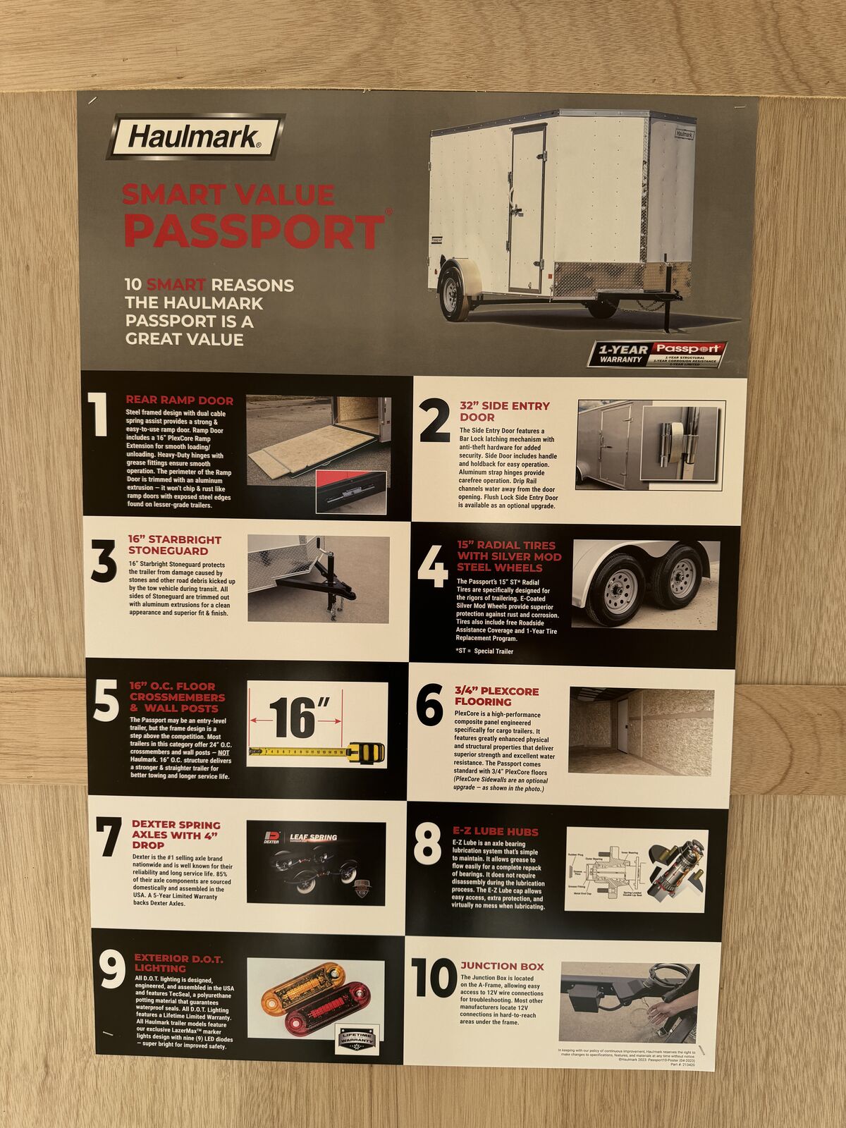 The Passport® is your ticket to carefree and reliable cargo hauling that’s easy on your wallet. It’s a perfect fit for recreational and light duty applications. Although classified as an “entry-level” trailer, the Passport® is loaded with quality features found on much more expensive trailers. The standard V-nose is not only stylish, but improves handling and MPG. No matter your hauling needs . . . count on the Passport® to deliver your valuables safe and secure to your final destination.
