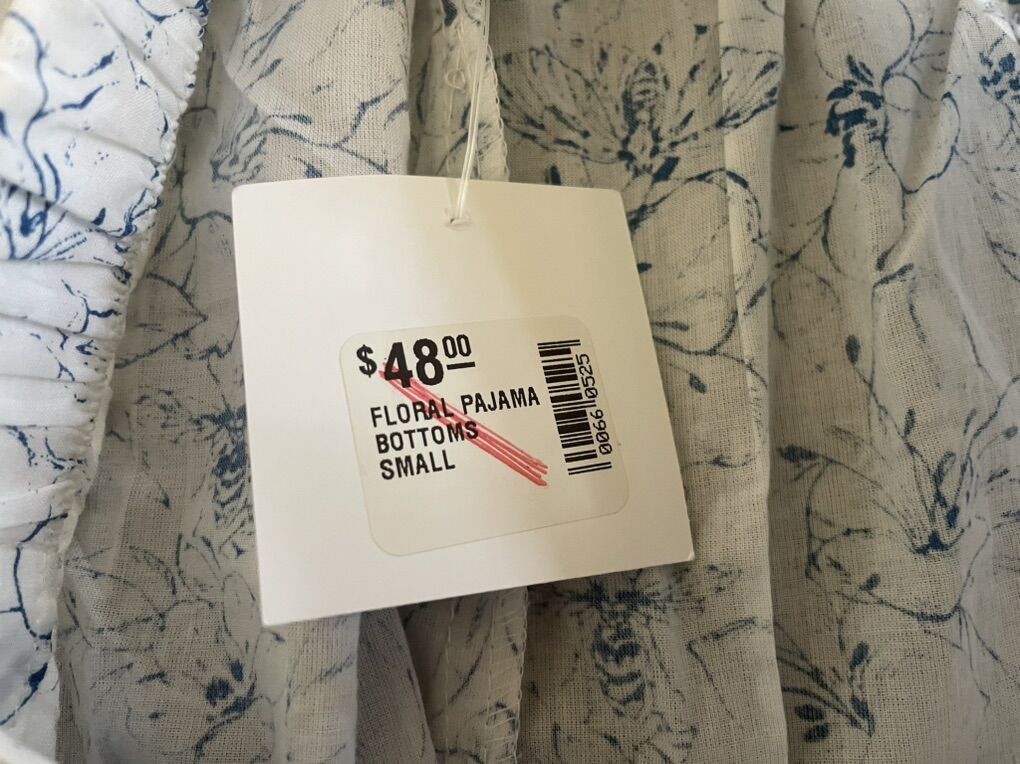 I have a really cute pair of new pajama bottoms. They are a lightweight fabric that is white with dark blue flowers and bees. They are a size small. They were sold at Amy Boutique and the price tag shows they were $48. See my other ads for jewelry, artwork, home decor and more.