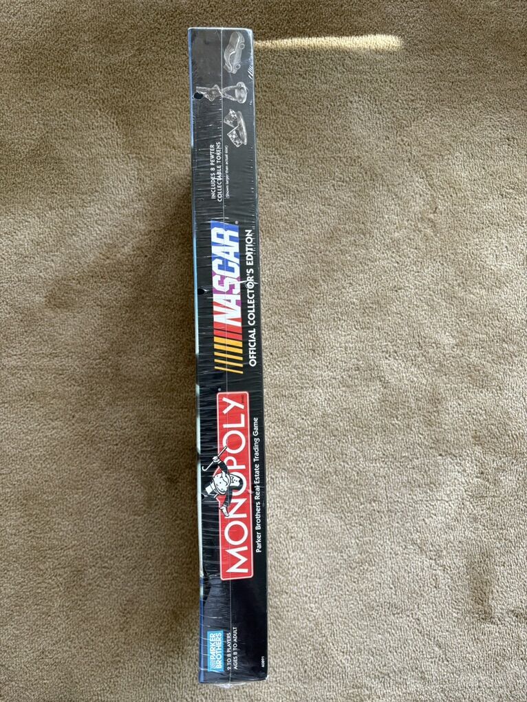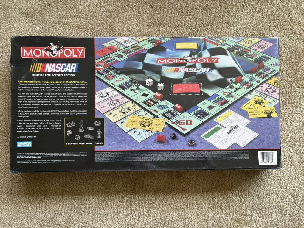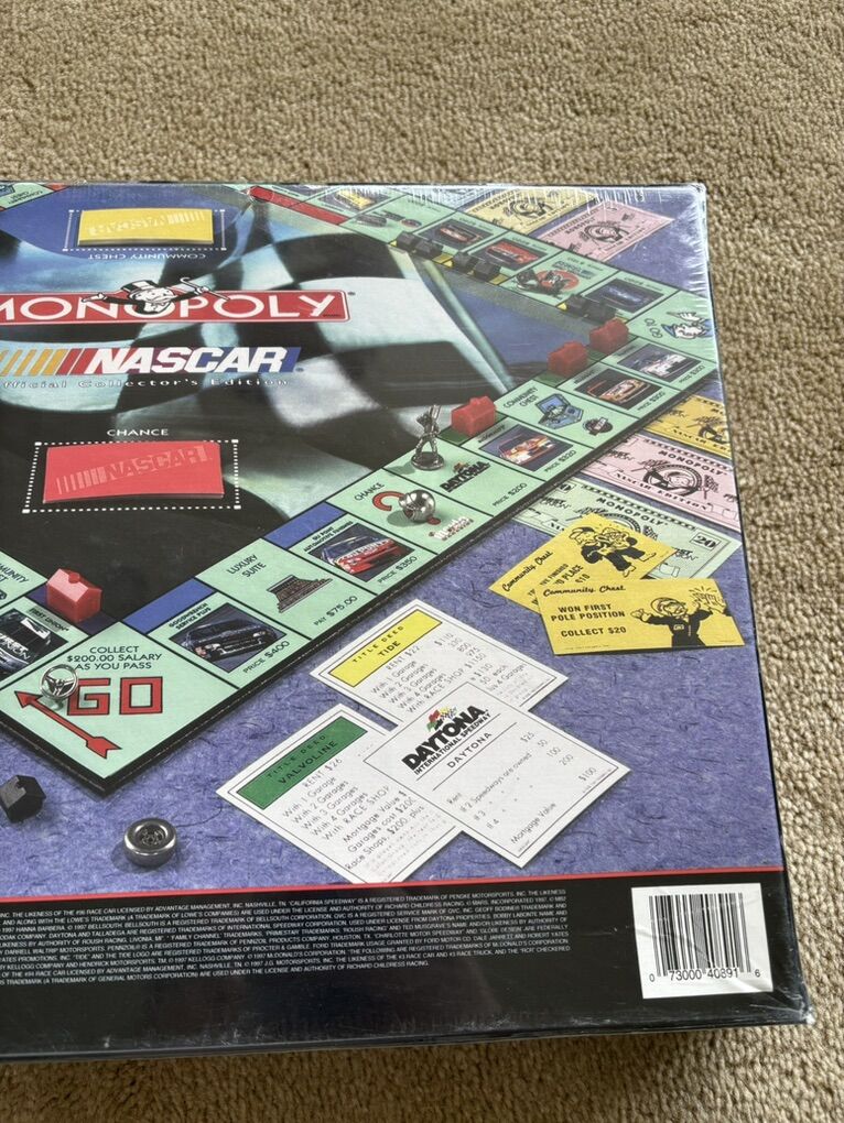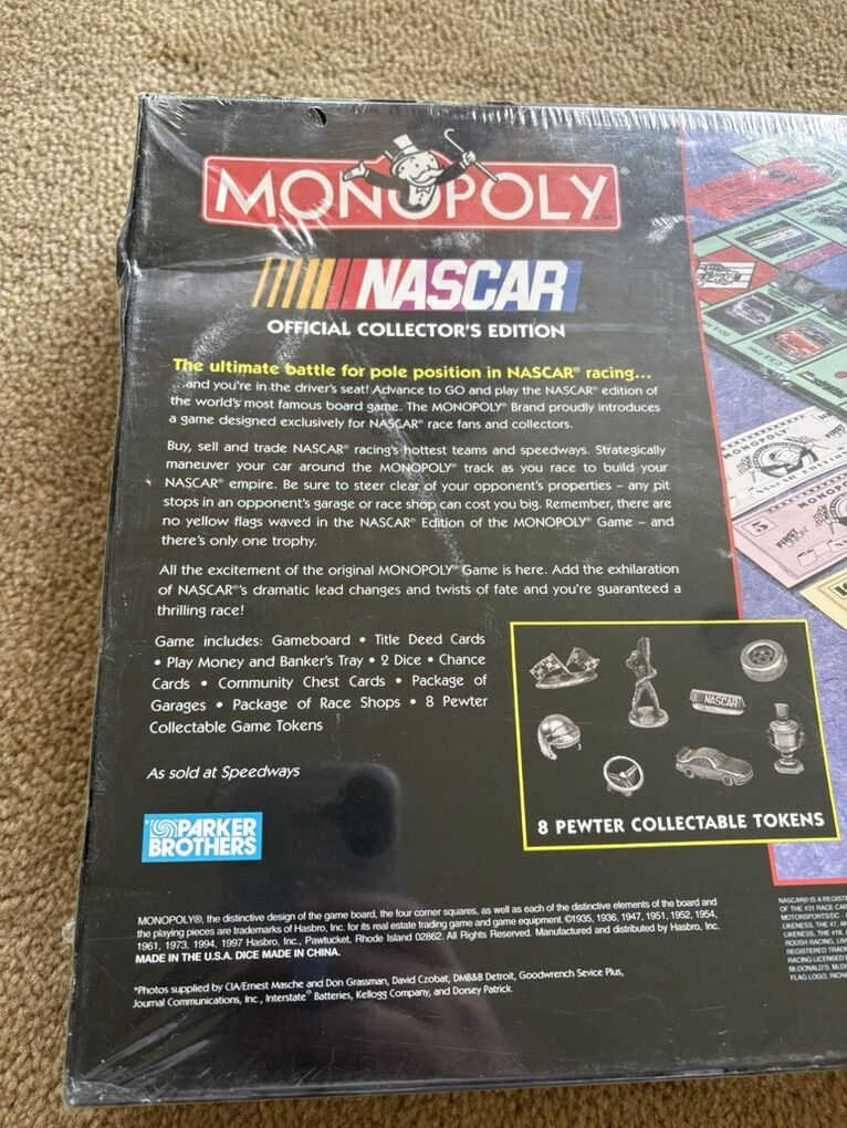 NEW (sealed in plastic) Monopoly: NASCAR Official Collector's Edition board game. Fast-dealing property trading game. 2-4 players, ages 8+. By Hasbro, Parker Brothers, 1997. New, unopened condition. One corner slightly dented. Text only. Cash or Venmo.