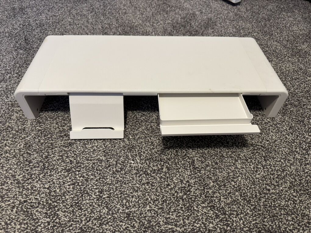 ApplePayHere is a sweet foldable computer monitor stand with a storage drawer and a phone stand.