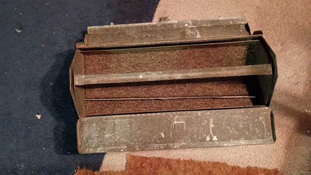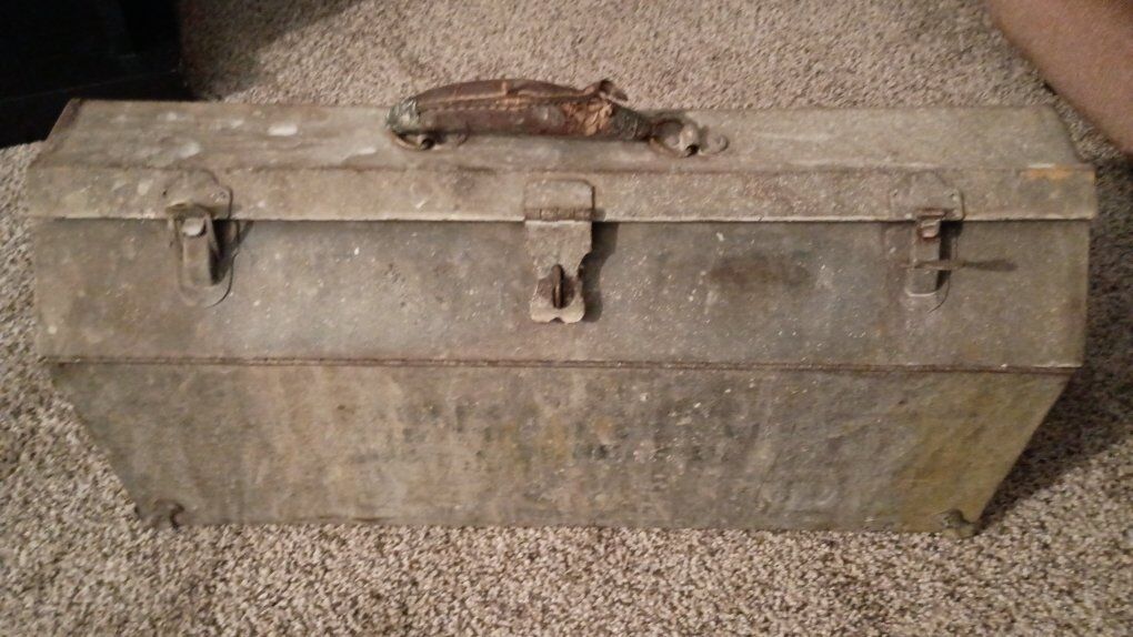 vintage Dunlap metal tool box 9" wide, 10" tall, 1'7" longer has locking feature leather handle also known at casket style