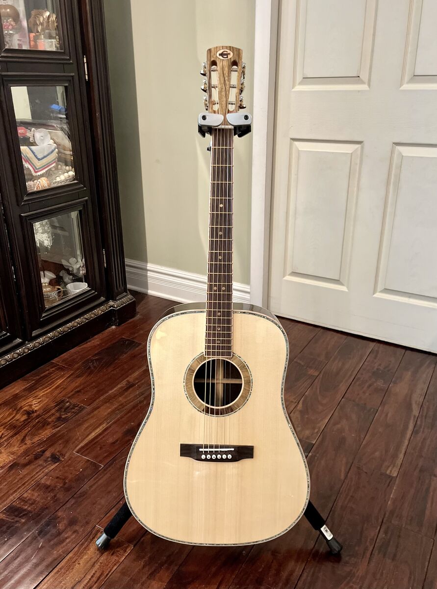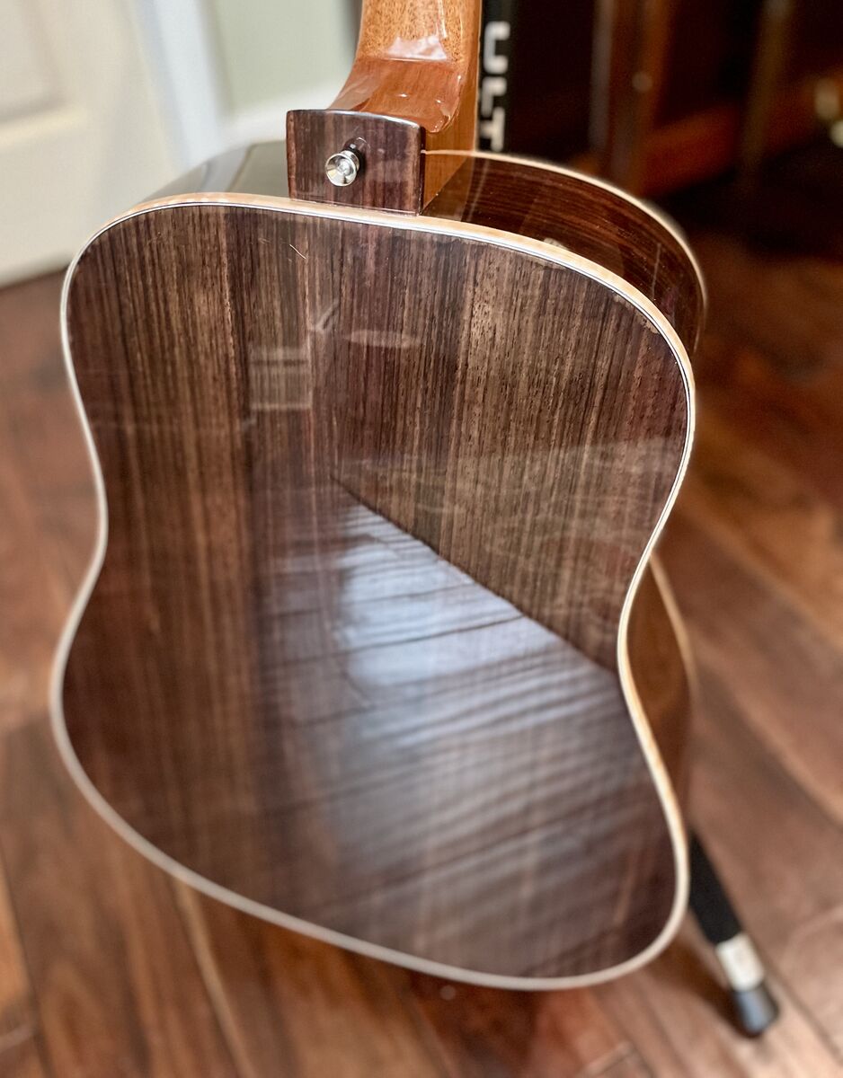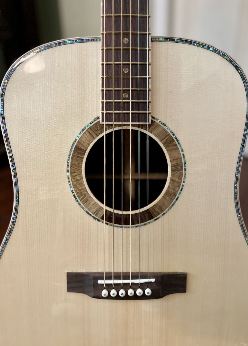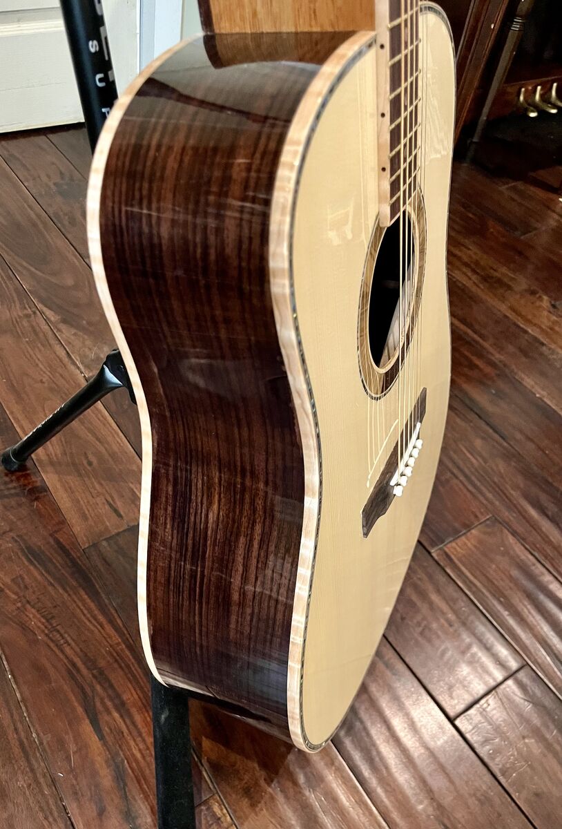 This guitar is based on a Martin Dreadnought (my Sundance model). It is made of East Indian Rosewood back and sides with an Englemann Spruce top. Rosewood fingerboard and bridge, gold frets, and gold Grover tuning machines. Body and fretboard are bound in Flamed Maple. Lots of Abalone and custom touches! All woods are hand selected and top of the line. Bone nut, saddle and bridge pins.