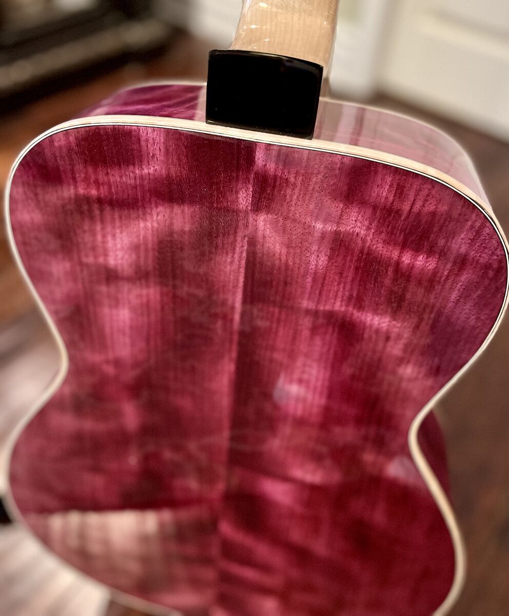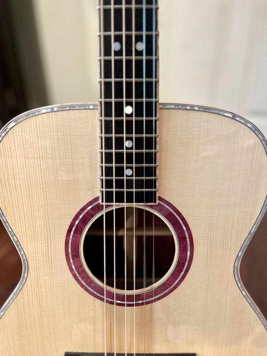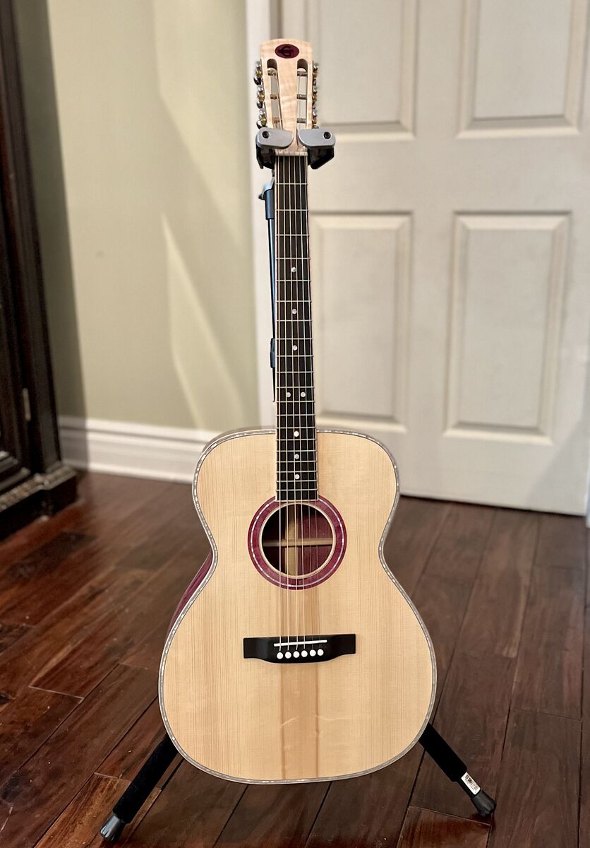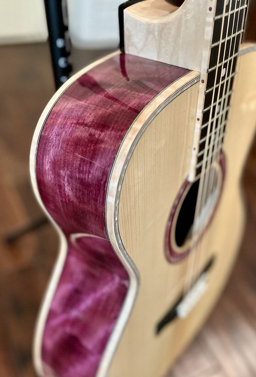 This guitar is based on a Martin OM (my Aspen model). It is made of Exhibition Grade Purpleheart back and sides with an Englemann Spruce top. Indian Ebony fingerboard and bridge, nickle frets, and Grover tuning machines. Body and fretboard are bound in Flamed Maple. Lots of Mother of Pearl and custom touches! All woods are hand selected and top of the line. Bone nut, saddle and bridge pins.