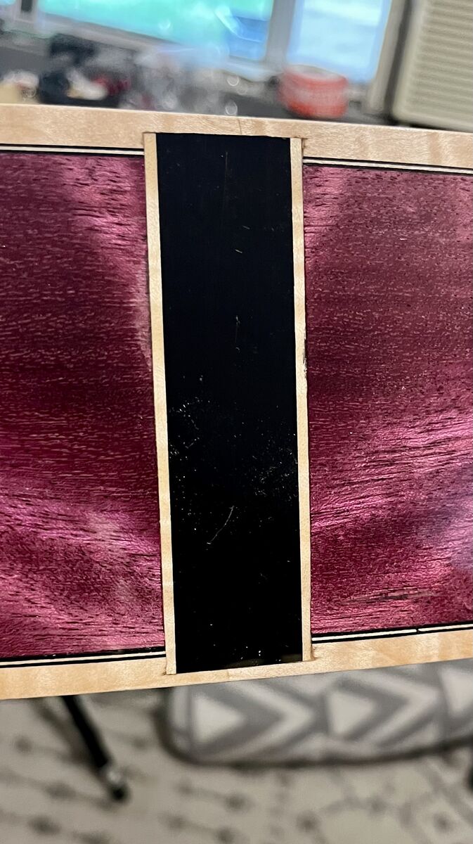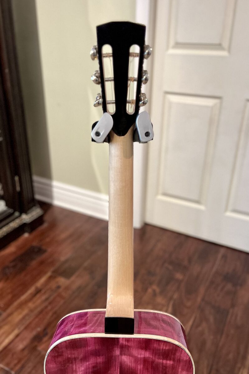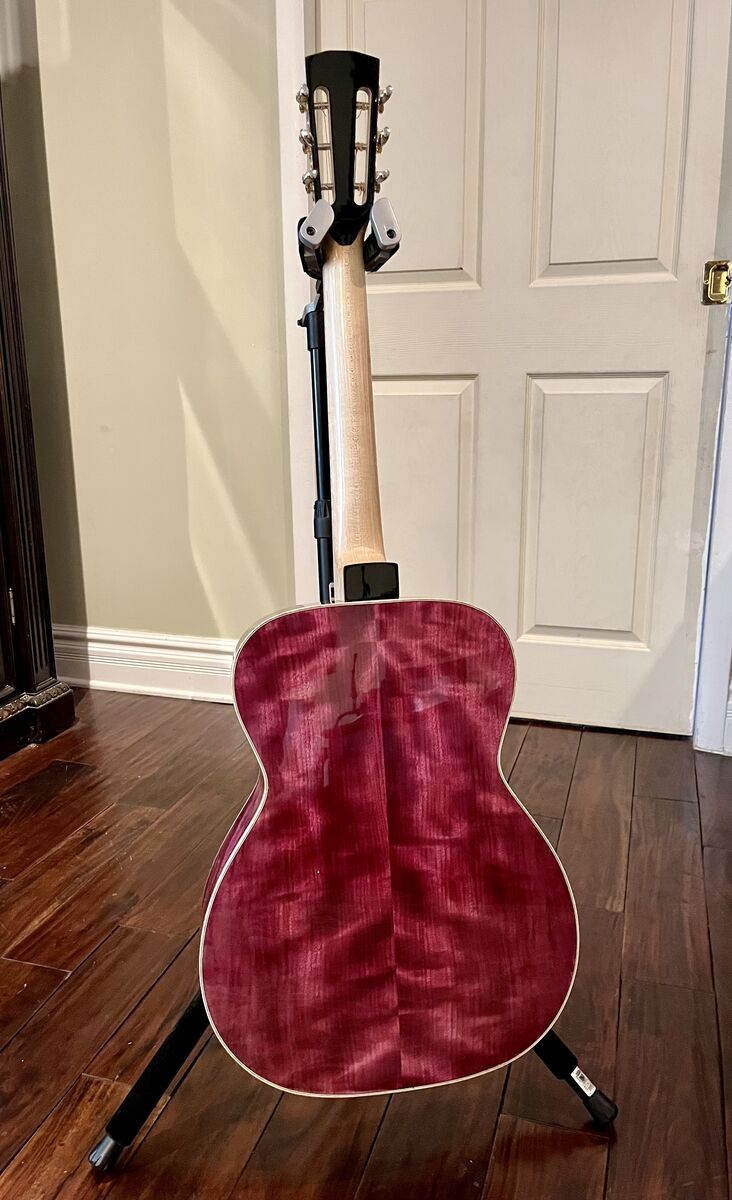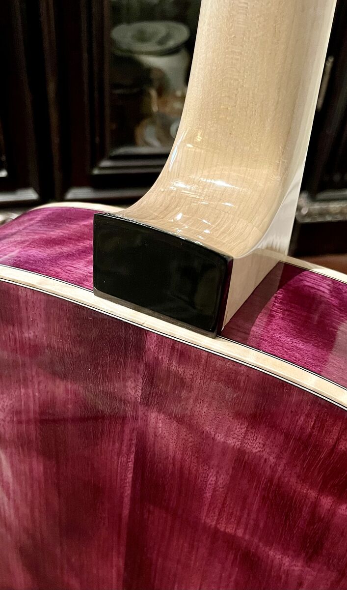 This guitar is based on a Martin OM (my Aspen model). It is made of Exhibition Grade Purpleheart back and sides with an Englemann Spruce top. Indian Ebony fingerboard and bridge, nickle frets, and Grover tuning machines. Body and fretboard are bound in Flamed Maple. Lots of Mother of Pearl and custom touches! All woods are hand selected and top of the line. Bone nut, saddle and bridge pins.