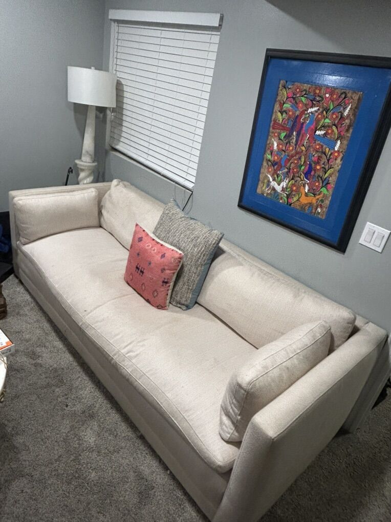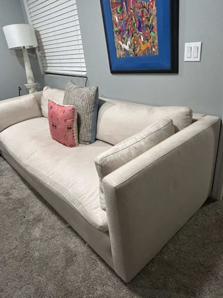 CashAppCustom 100% Down Filled Single Cushion Sofa with two back cushions and two arm cushions. Tweed stitched fabric in an off white cream color with a herringbone stitch pattern you notice up close. It is 92 inches long and 38 1/2 inches deep I paid $5,300.00 for this sofa and customized the fabric as well as the down filling. There is zero foam in this couch, and is extremely well built. Asking $750.00 OBO