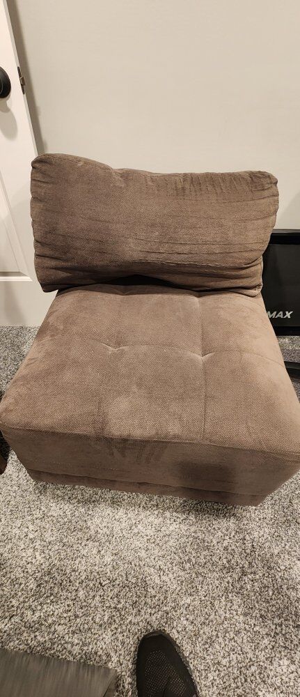 gently used sectional. very comfortable. all pieces interlock and are easy to move around. side pieces and ottomans are 27" wide and corners are 32"