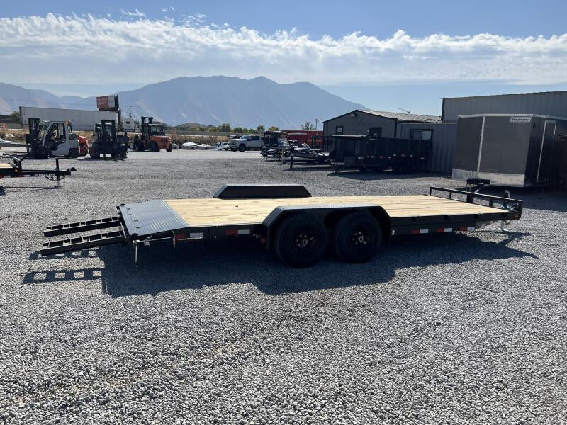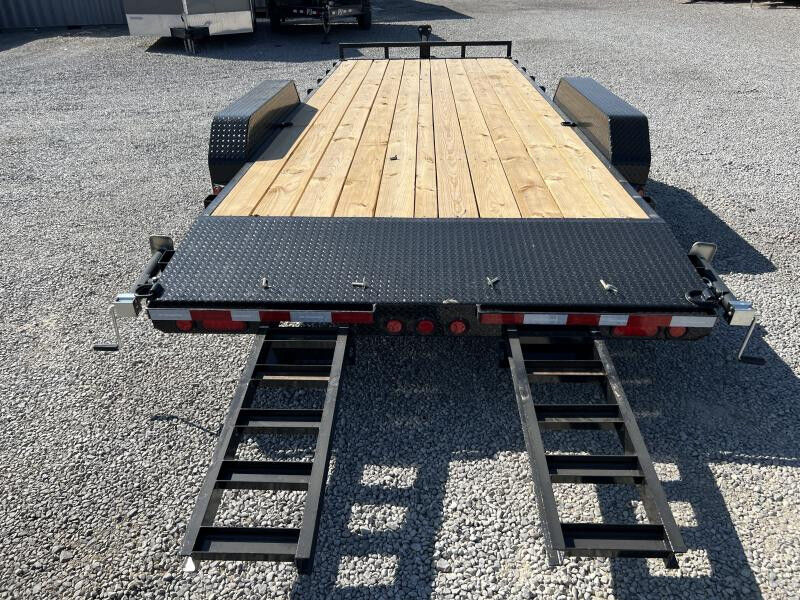 Stock Number: PJ6222 Trailer Includes Following Options: 2' Dovetail w/ 5' Rear Slide In Ramps Standard Options: 9,899 lbs. GVWR 5,200 lb. x (2) G.A.W.R. 5/16" Grade 70 Safety Chain w/Clevis hook (2 each) Top Wind Drop Leg Jack (7,000 lb.) 2 - 5,200# (Dexter) Electric Axle 6-Leaf Slipper Spring Suspension 15" Black Spoke Wheels ST225/75R15 Radial Tires (2,540 lbs.) 3-5/8" x 1-1/2" (ID) Stake Pockets 9" x 72" Treadplate Aluminum Fenders 5" Channel Tongue 3" Channel Crossmembers on 16" Centers 2" Treated Pine Lumber Deck 83" Wide Deck All-Weather Wiring Harness (7-way RV) Powdercoat 5 year Dexter Axle Warranty WASATCH TRAILER SALES - LARGEST TRAILER SELECTION IN UTAH Springville: (801) 528-1581 | 1180 S 2000 W, Springville UT, 84663