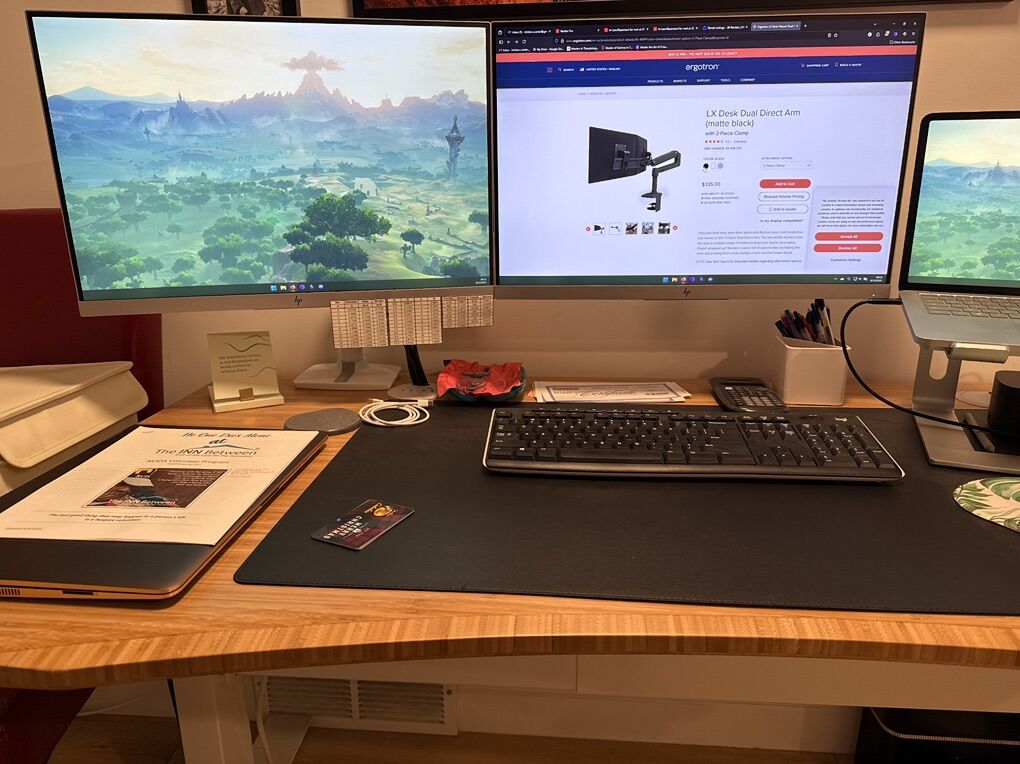 PayPalBlack dual monitor arm for mounting to a desk with a clamp (no screws!). I’m keeping my white one because really like it because it is low profile and saves a bunch of space on my desk. I had this one on my desk at the office but am fullly remote now and don’t need it. Keeps your monitors together and aligned, supports two screens up to 25” in size, has great adjustability and robust construction.