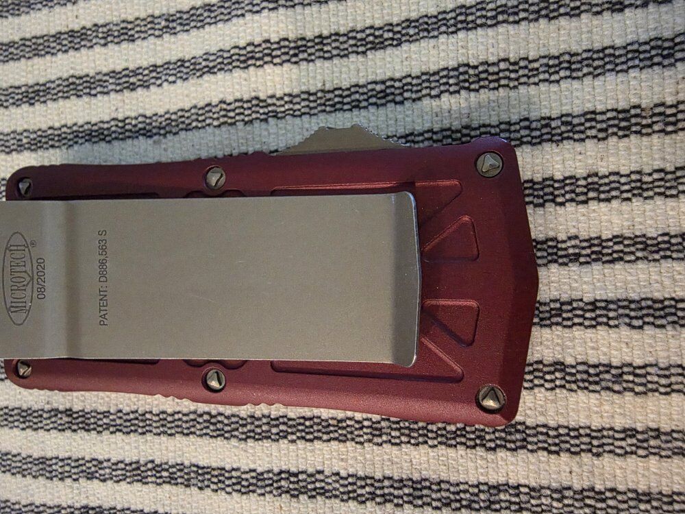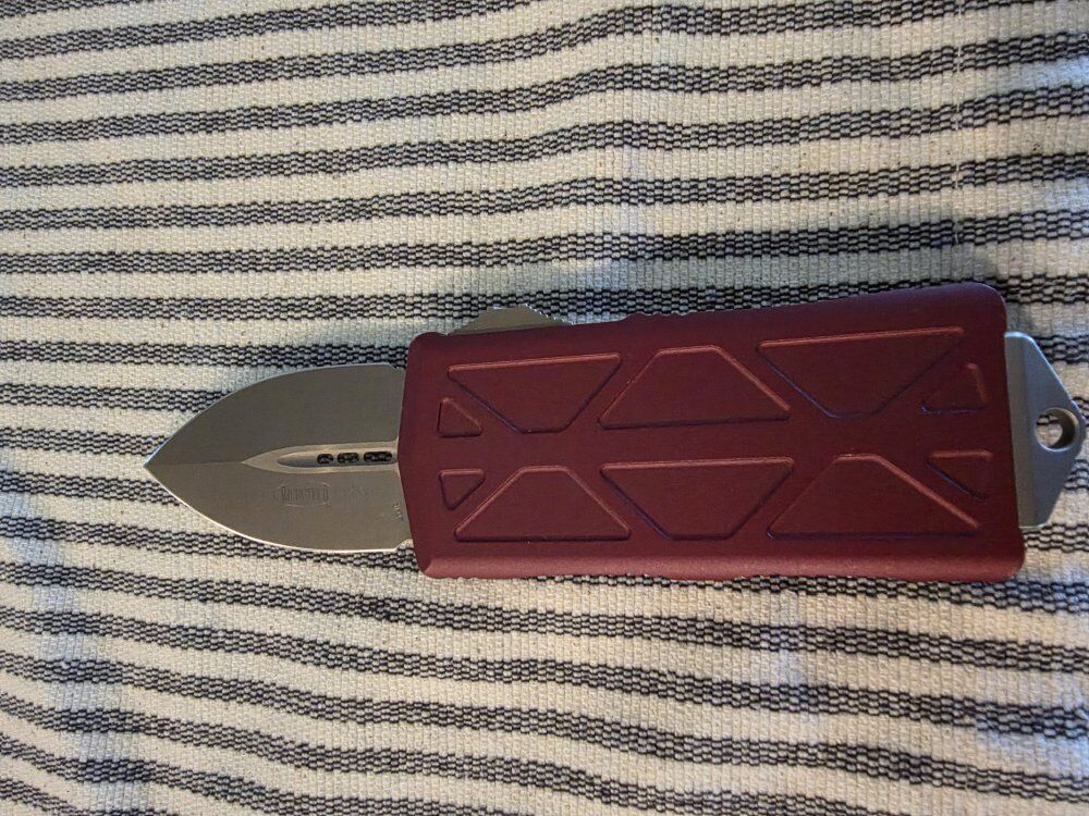 My Microtech Exocet in the merlot red with the bronze double edge dagger blade in 204P blade steel which is probably the best steel you can get in a knife. I bought it new from Eknives a couple of years ago, I thought I would use it alot but I just haven't really at all as I use my other Microtechs. This is probably the best looking knife I have in my collection if I'm going to be honest, the red fits so well with the bronze. This knife is sold out everywhere you will not find this combo and be able to purchase it. Condition is used excellent as I have cut maybe one piece of paper with it but other than that it has sat in my storage box, I do have the original box if thats important to you. Cash only no trades, thank you