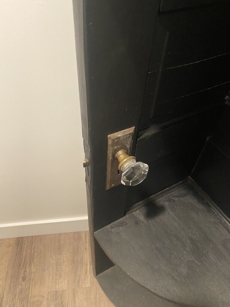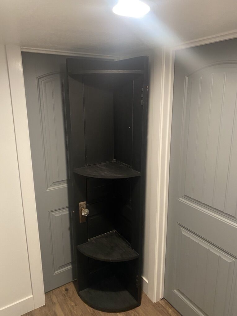 Antique door repurposed into a corner shelf. Very cool, unique