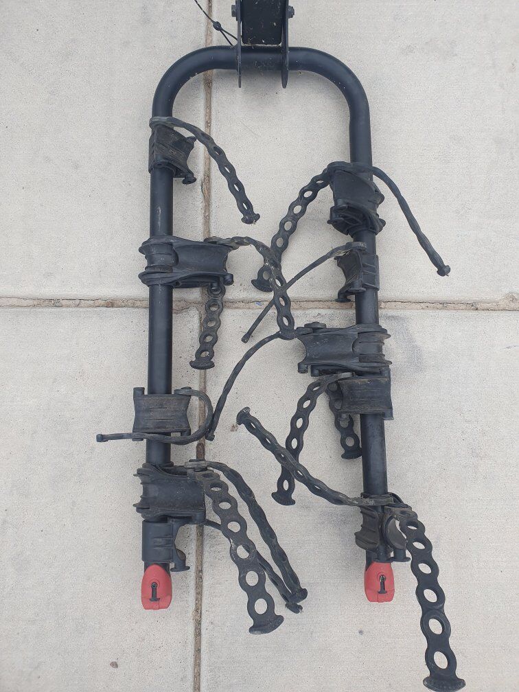 Yakima hitch-mounted bike rack, holds up to 4 bikes. Fits standard 2” receiver hitches. Heavy-duty steel construction with sturdy rubber straps to keep bikes secure. Rack tilts down for easier access to the back of your vehicle. Used only once or twice but in good working shape. All straps included. A few scuffs from normal use, but nothing that affects performance.