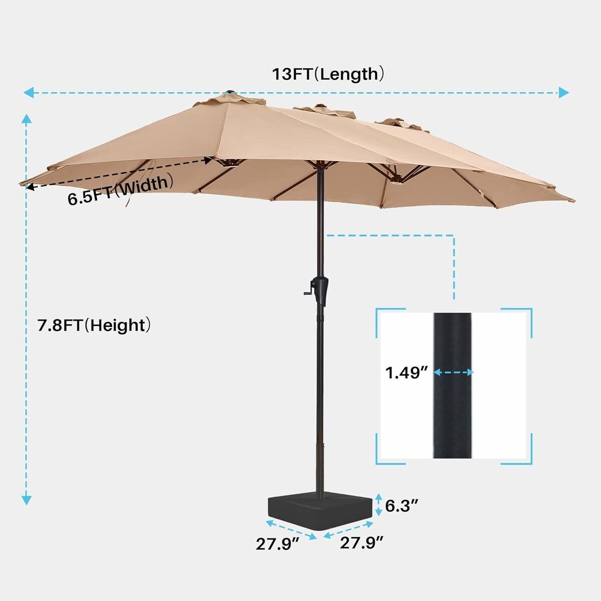 Extra Large Shade: Huge umbrella shade for 2-6 seats, and also can cover outdoor furniture set or dining set, this 13ft patio table umbrella creates cool shadow for family gatherings or outdoor leisure time