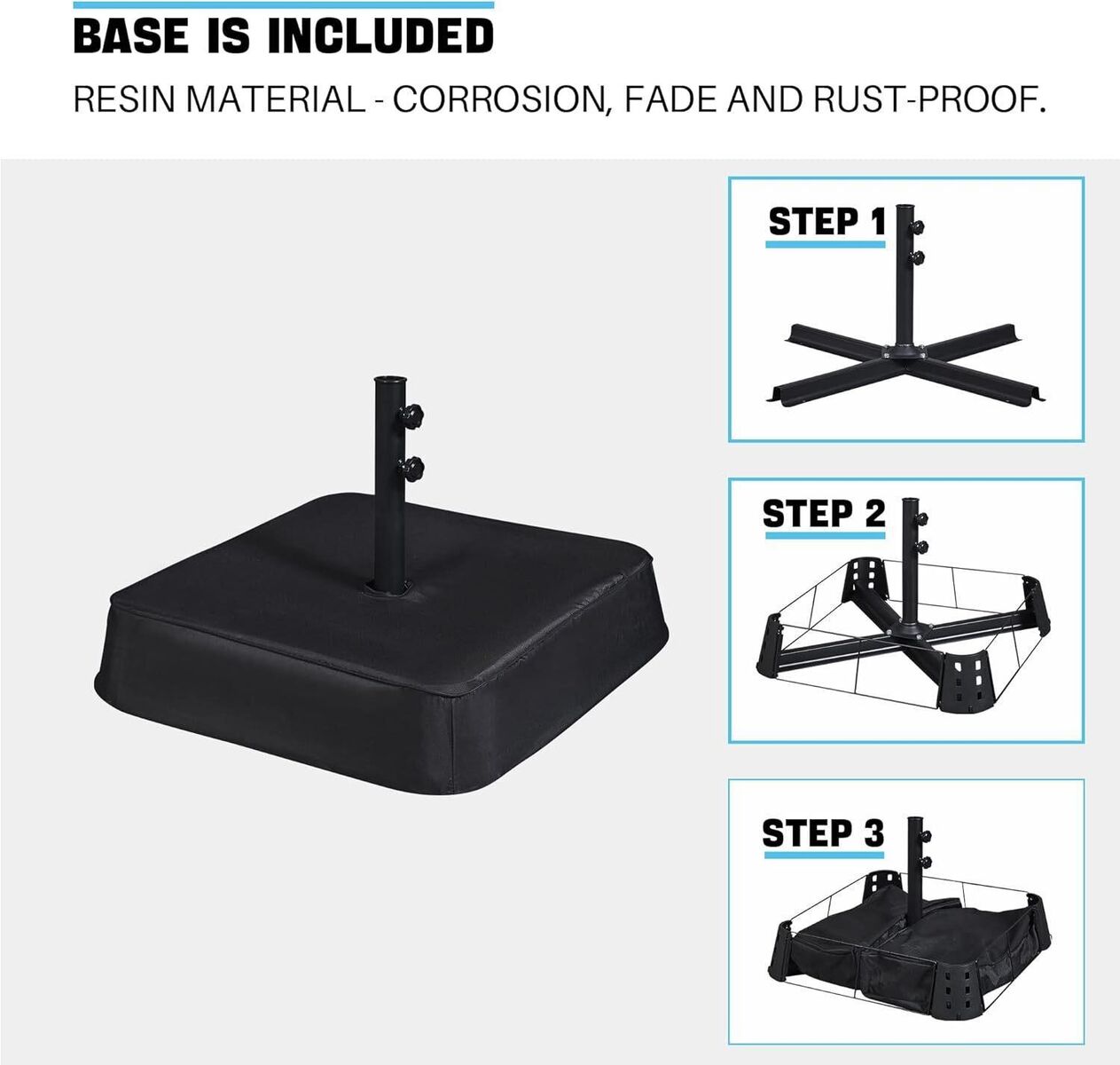 Base Included: Made from resin material, the umbrella base is corrosion, fade and rust-proof. Comes with a durable metal frame and 2 sandbags. Note: Fill each sandbag with 66 pounds to ensure stability