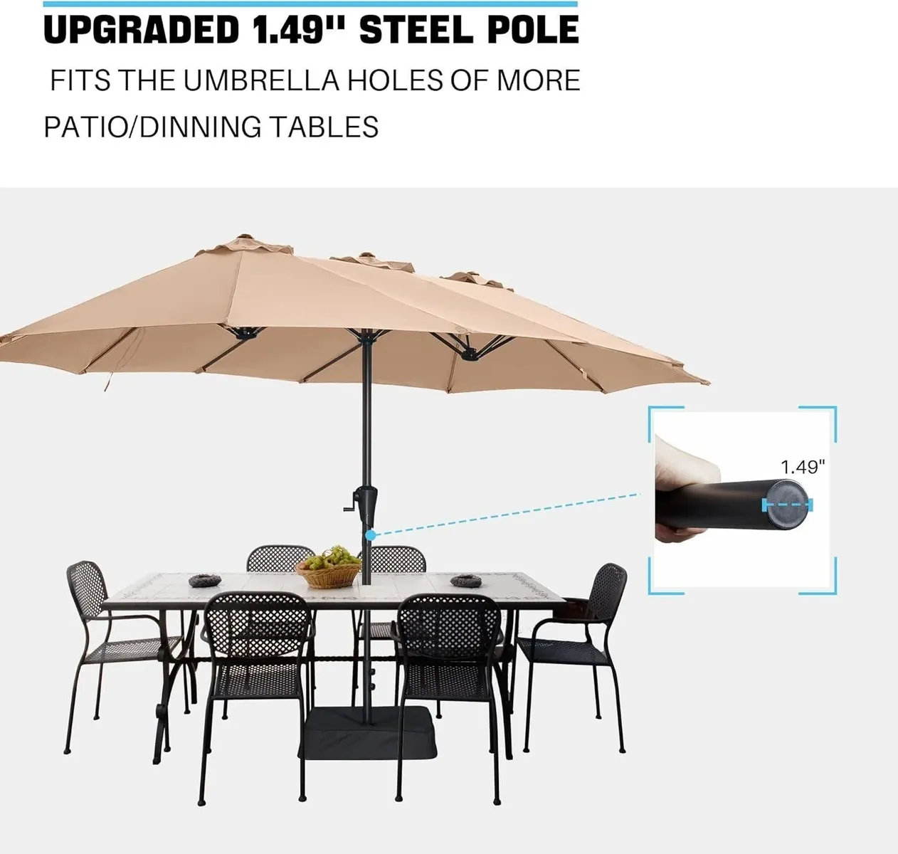 38mm Diameter Aluminum Pole: Powder-coated and rust-proof aluminium pole is 38 mm in diameter, making this patio umbrella with base perfectly fits most outside table holes