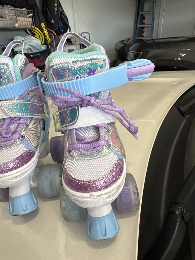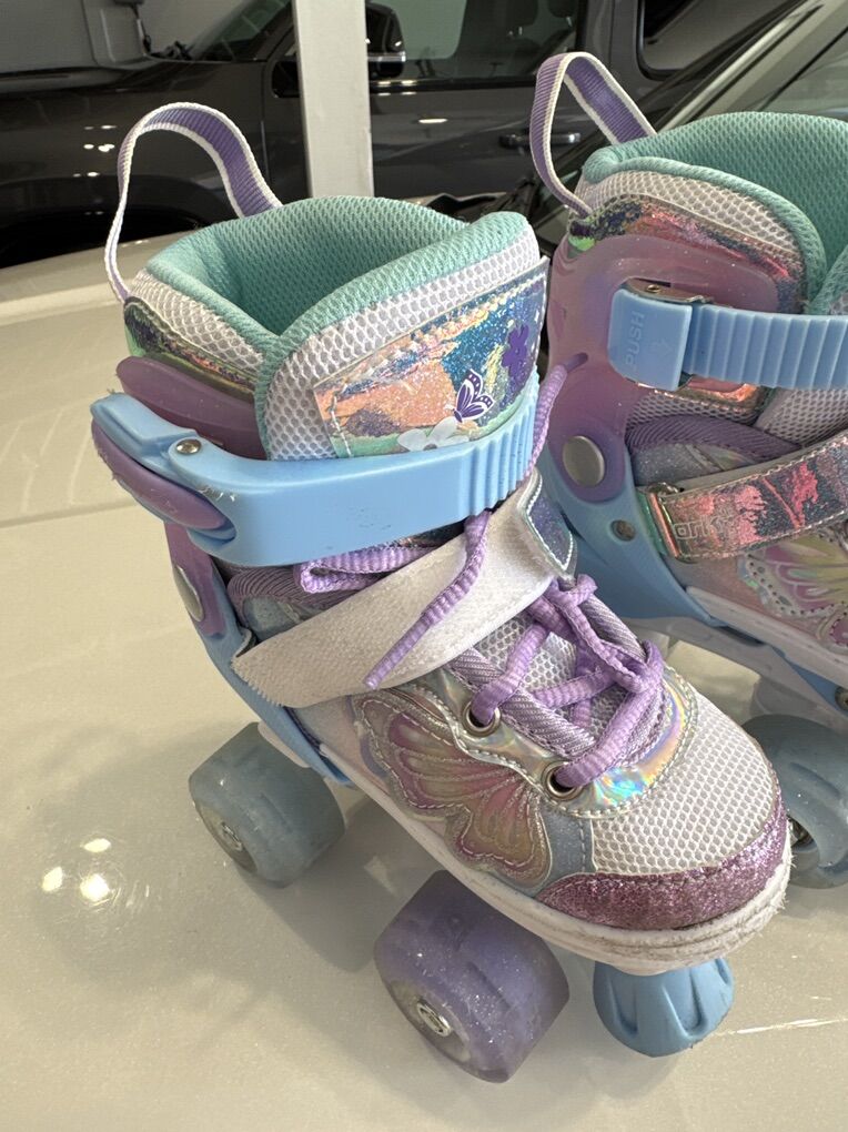 ApplePayIn very good condition, only worn/used a handful of times. (my girls are not natural skaters ) Fully functional, no major issues, cracks, breaks etc. very easy to adjust the sizes for smaller feet and then bigger as she grows. Plus, I’m told, these are super cute