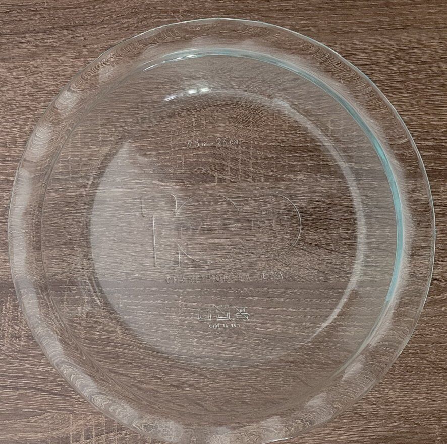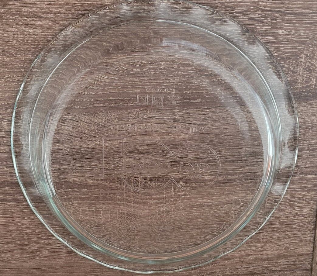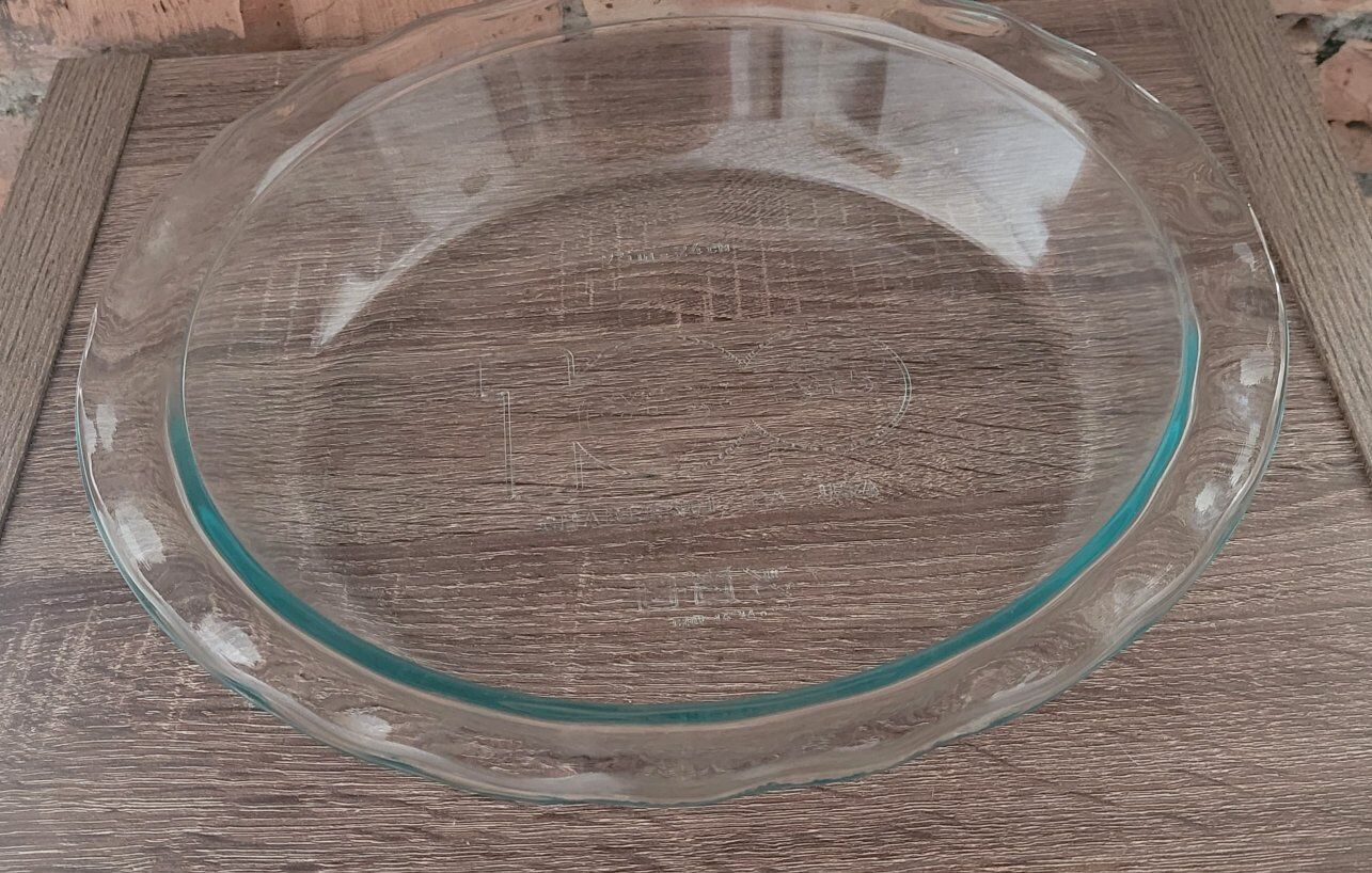 Pyrex 100th Anniversary Limited Edition Embossed Pie Plate. It is a collectible item commemorating Pyrex's 100th anniversary. The plate is made of clear, high-quality, tempered glass and features an engraved design. It measures 9.5 inches in diameter and is suitable for baking pies. This plate is safe for use in the oven, microwave, refrigerator, freezer, and dishwasher