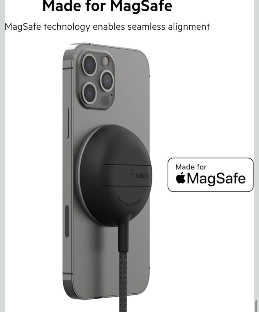 Selling my used Belkin Wireless Charger for MagSafe, 15W Fast Charging Pad (PSU Not Included) w/ Kick Stand & 6.6ft Long Braided Cable, Compatible w/ iPhone 15, 15 Pro, 15 Pro Max, 14 & 13, and iPhone Mini - Black No longer use. Asking 5$ OBO
