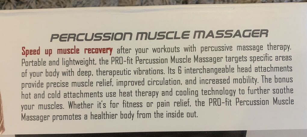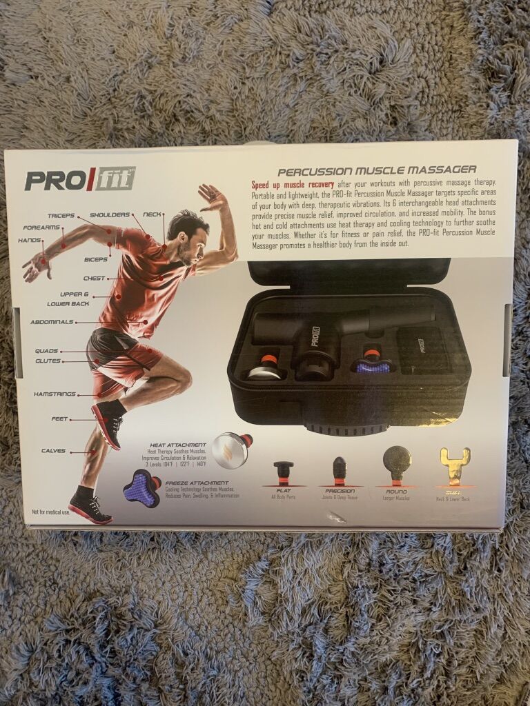 ApplePayProFit Massage gun. New in box! Includes 6 attachments and carrying case. 4 hrs of use before recharging. Great for that hard-core athlete, the weekend warrior, and anyone needing some relief from pain and discomfort.
