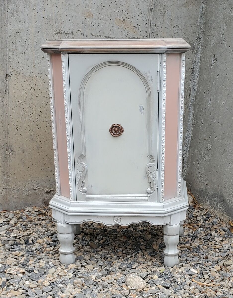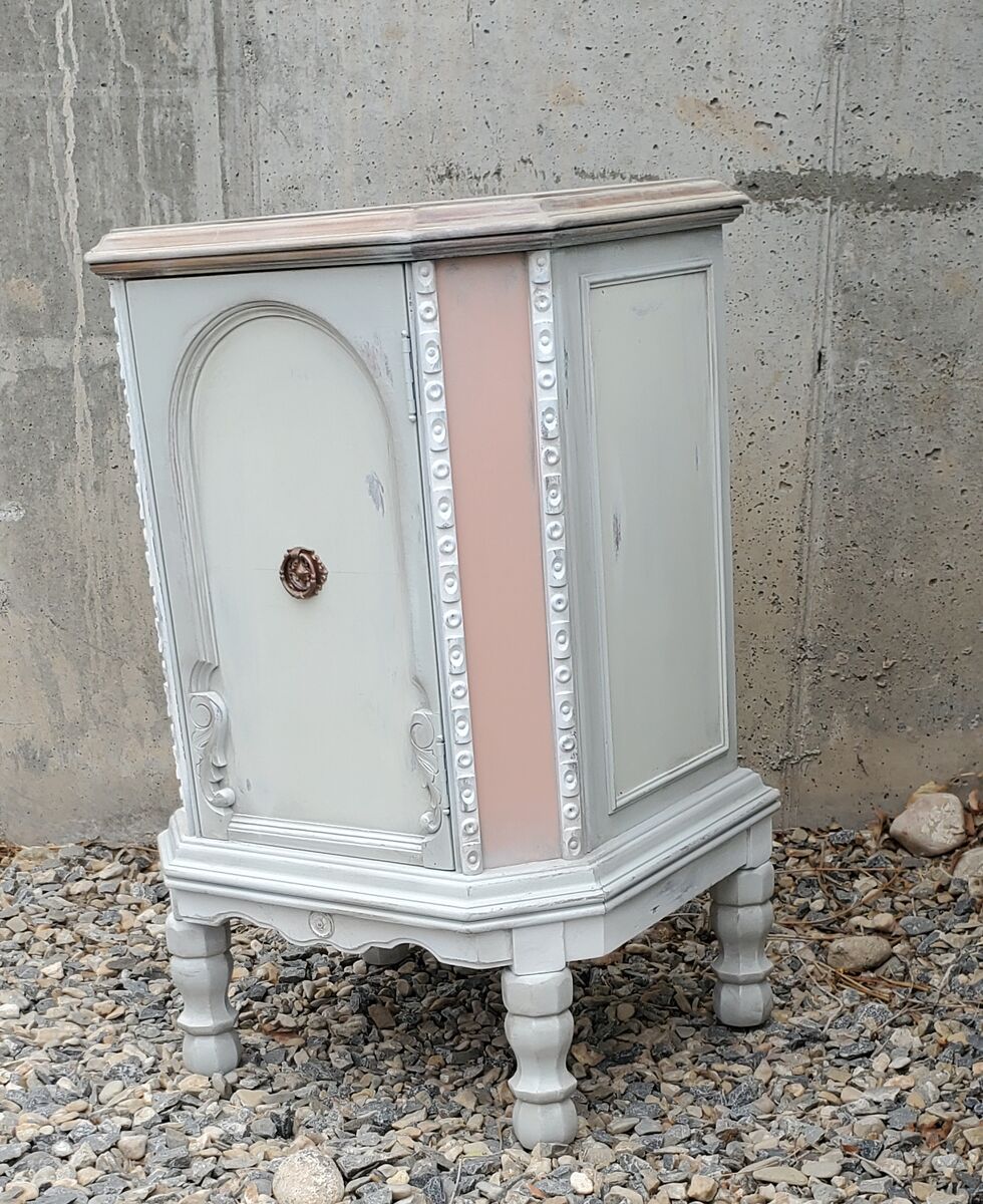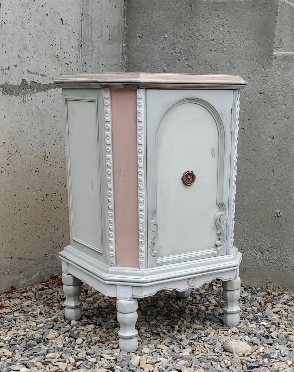 SPRING SALE! NOW 20% OFF! This lovely, RARE nightstand has recently been refreshed with a new matte grey, beige, blush pink, and white paint job. It has subtle antiquing and distressing. The top is white washed to accentuate the wood grains. It is solid wood, and is the perfect accent for your bedroom!