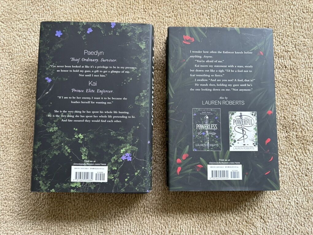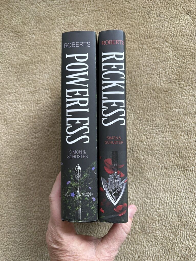Books 1 & 2 in The NYT bestselling Powerless Trilogy by Lauren Roberts: Powerless (2023, 494 pages), and Reckless (2024, 383 pages). First edition hardcovers in very good condition, including dust jackets. Text only. Cash or Venmo.