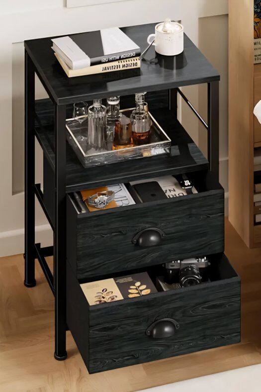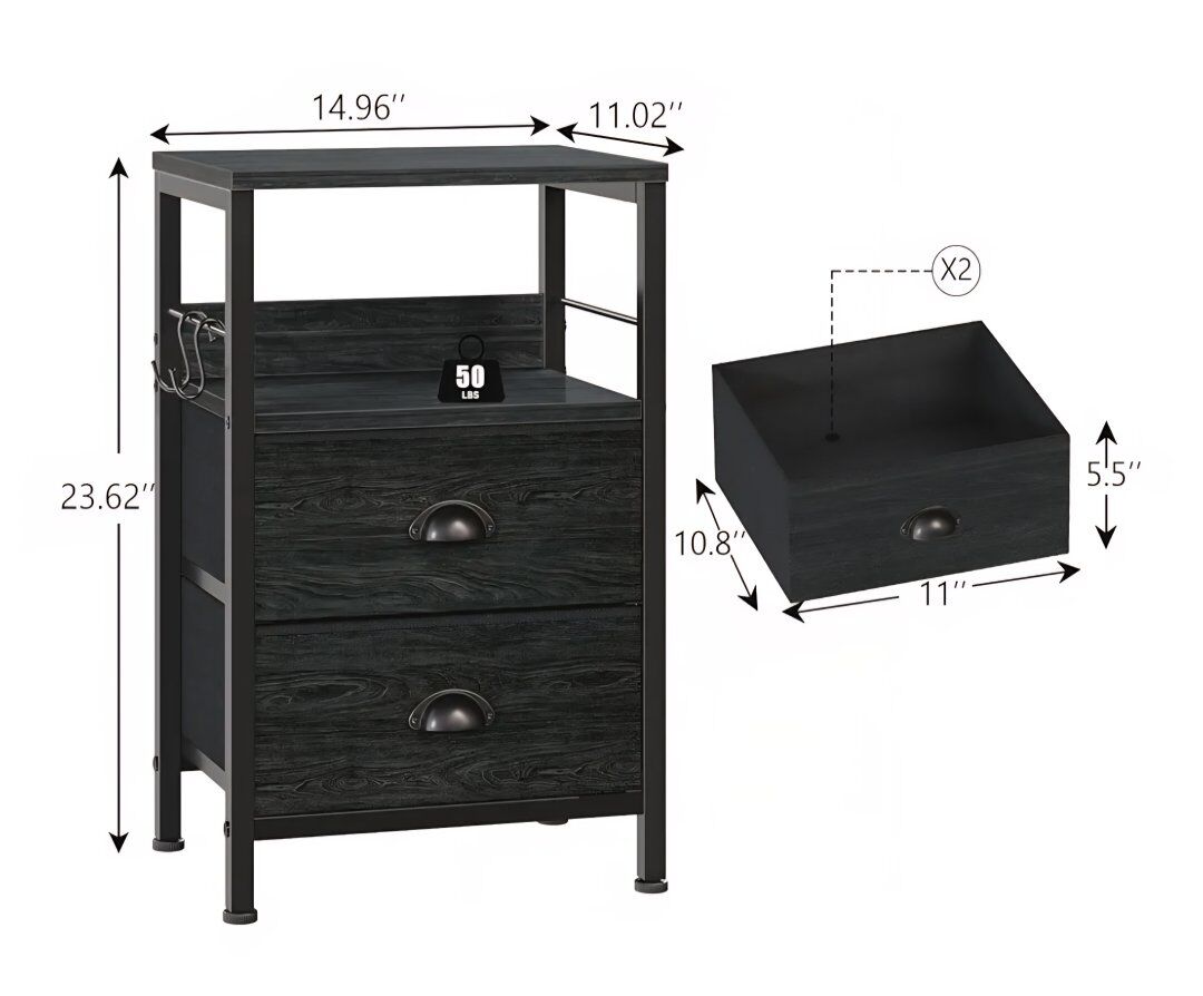 Furologee Nightstands Set 2, Night Stand with 2 Fabric Drawers, Bedside Tables with Open Shelf, Wooden Top, Hooks, Backboard Design, Metal Frame, End Tables for Bedroom/Living Room/Study/Black Oak. New. cash only please