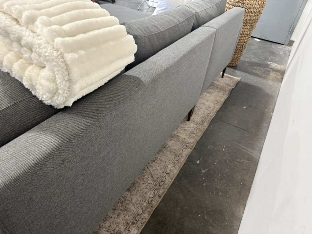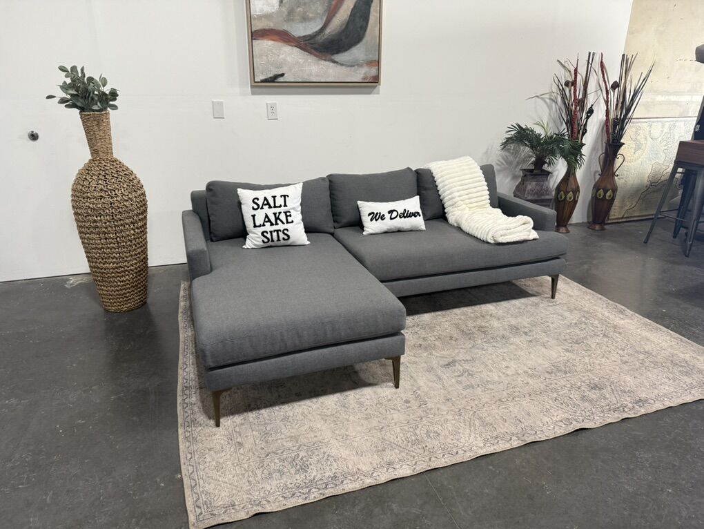 Follow Us On Instagram: SaltLakeSits Retail Price: $3100 Your Price: $1100 ️ Sleek modern West Elm Andes sectional with low-profile lines and tailored cushions. Upholstered in a rich dark gray fabric, this two-piece design includes a spacious chaise for stretching out. Its slim track arms and elevated frame give it a refined, contemporary look that fits effortlessly into any space. 🫧 Expertly Cleaned 🫧 Dimensions: 90” x 62”