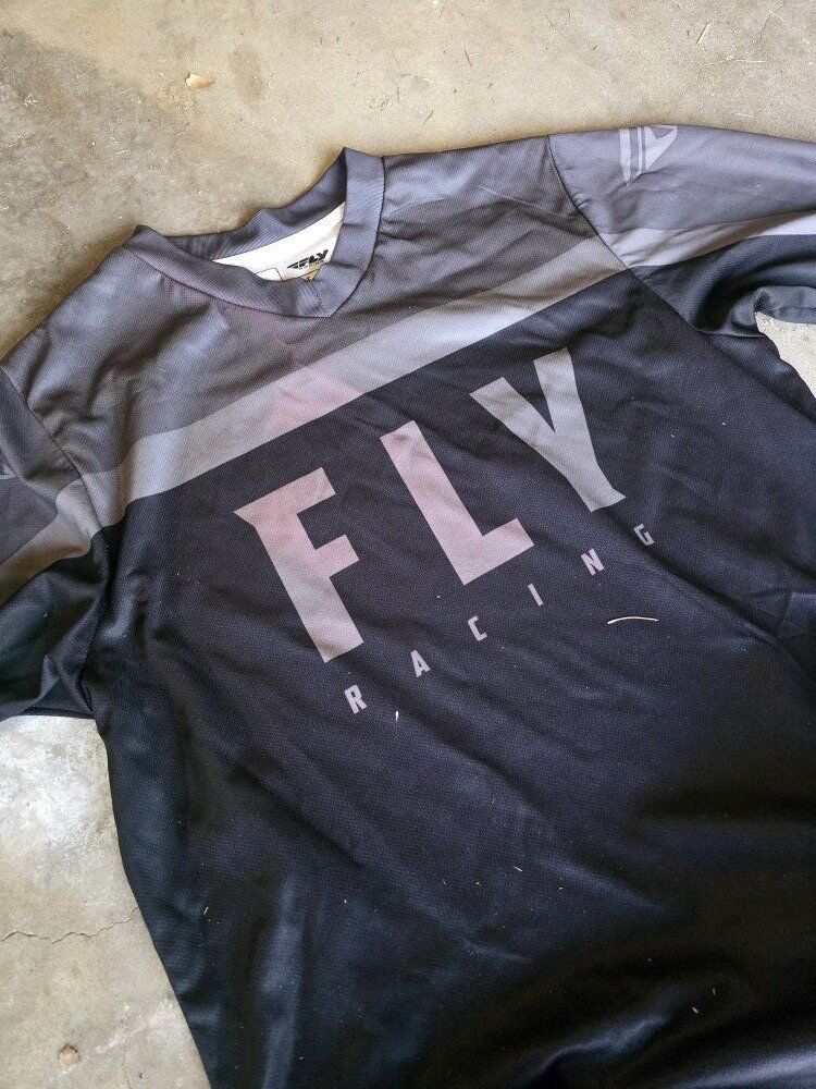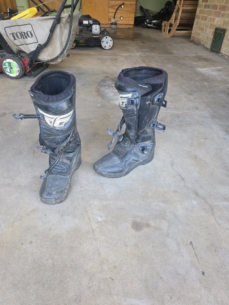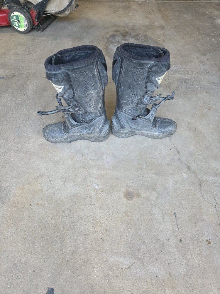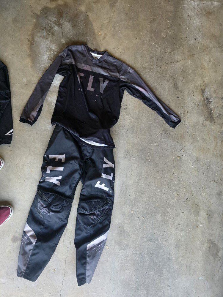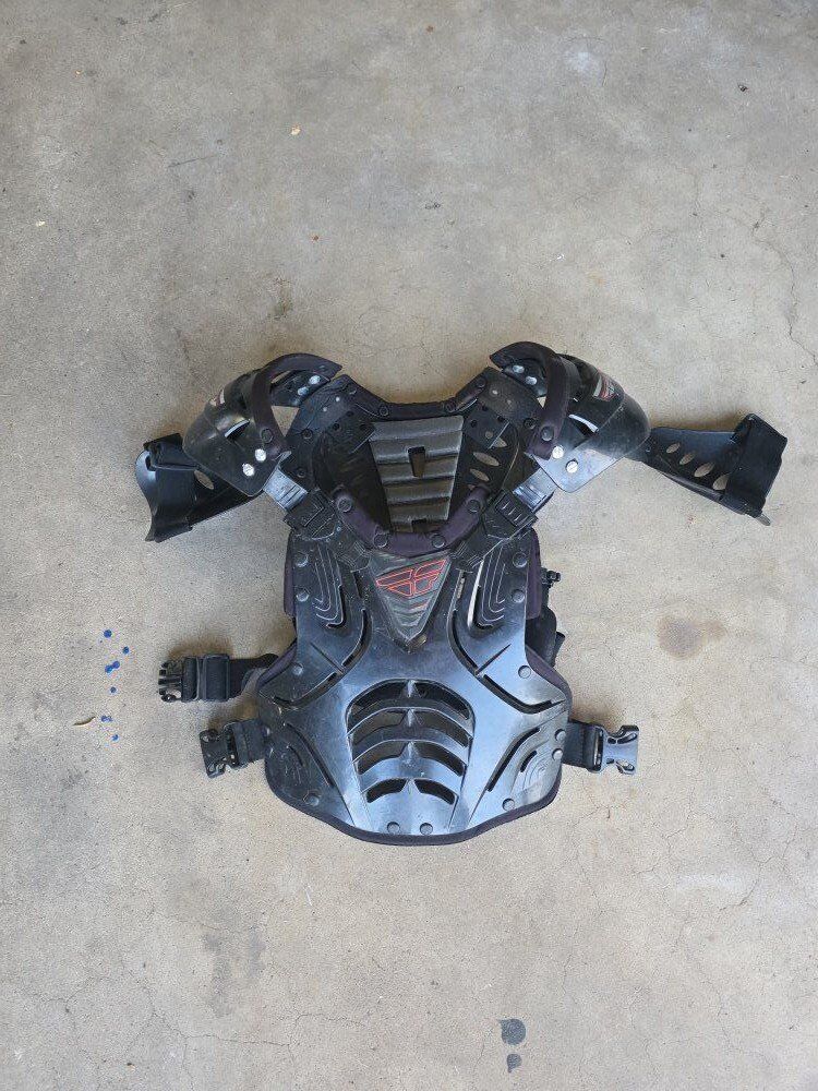 Both pants are 32. Black and white shirt is a Medium, black and grey shirt is a small but fits the same as the medium. The black and grey shirt has some sun fading on the front chest area, and the left arm. Boots are size 11 with some good wear in them. Chest protector is size small.