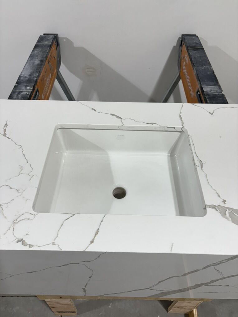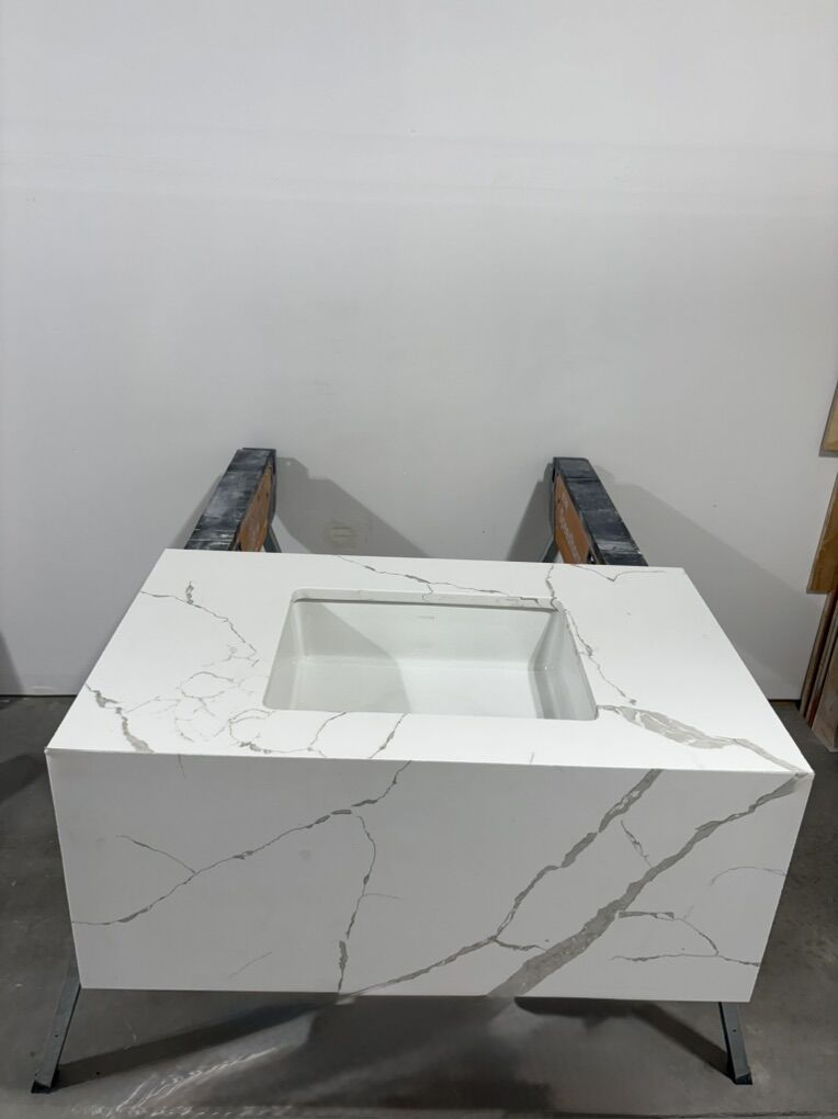 35” Floating vanity Calacatta Laza The stone is Quartz Calacatta Laza Dimensions W 35” H 15” D 21” Has a Kohler 2882-0 sink