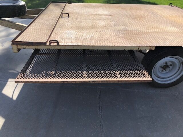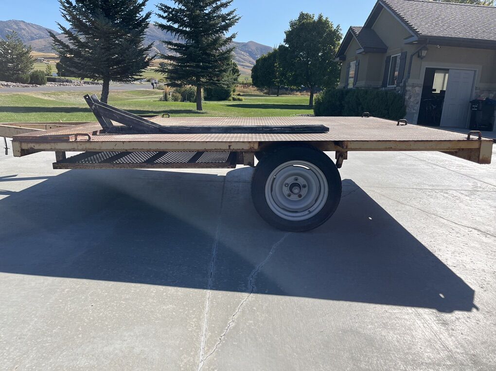 This is a very versatile trailer can carry Snowmobiles or quads or side by sides or quad and bike. It is an all metal trailer and has high ground clearance for off road adventures. Heavy Duty constuction built by a professionial builder using all new materials nothing on this trailer was used including the Axle,wheels and tires. Just a little paint and it could look brand new again..Pulls very good. The ramp is 48"wide. Ramp stores under the bed. Has 2" ball and matching spare tire....$1,500.00........Cash Only... No Checks... No Venmo
