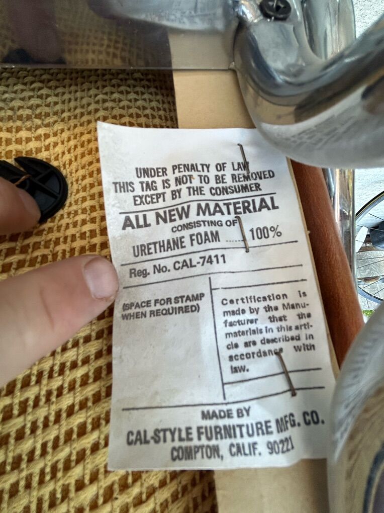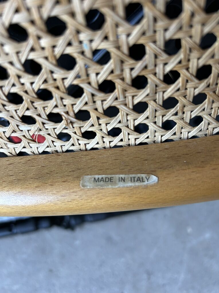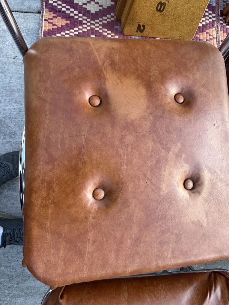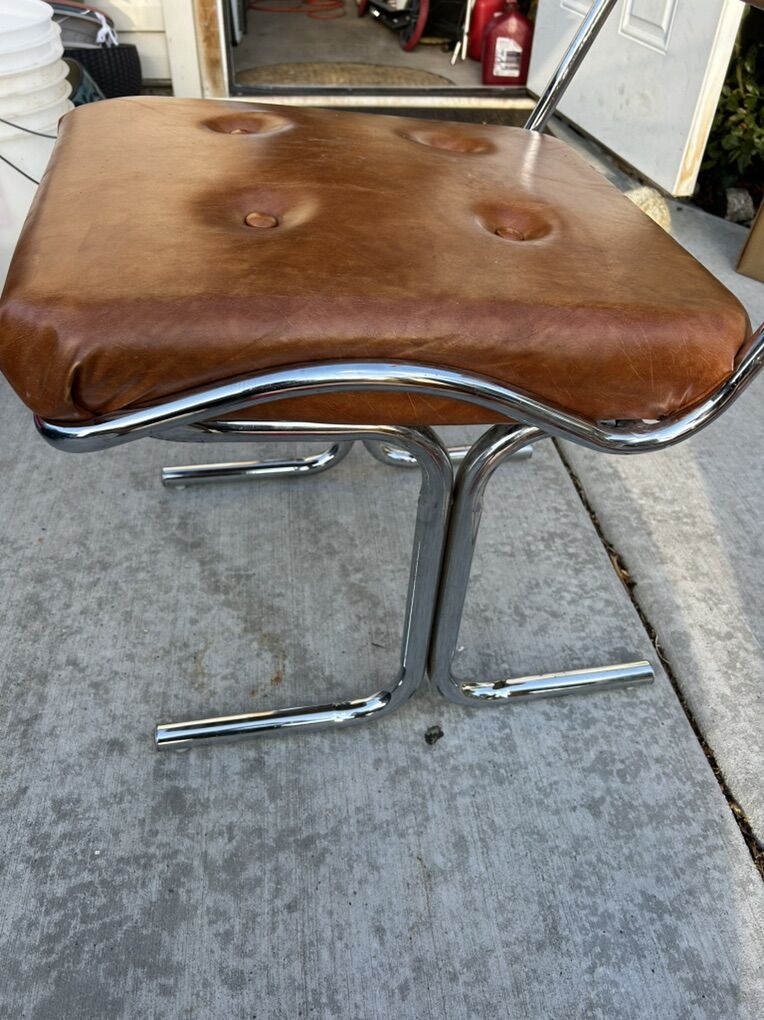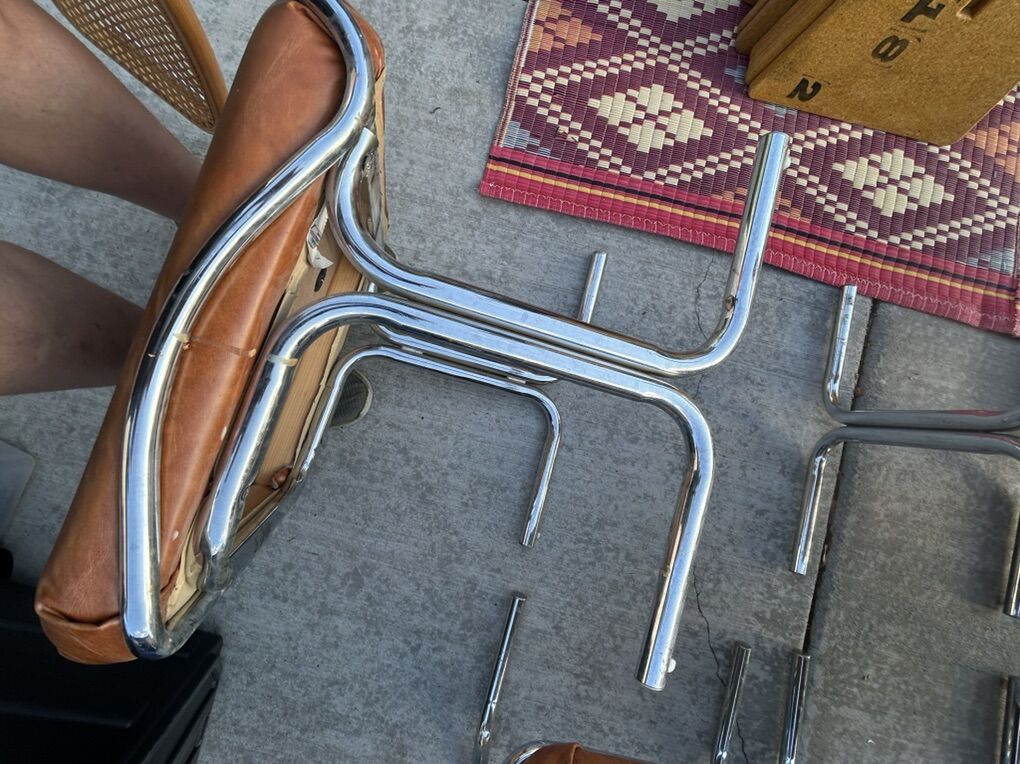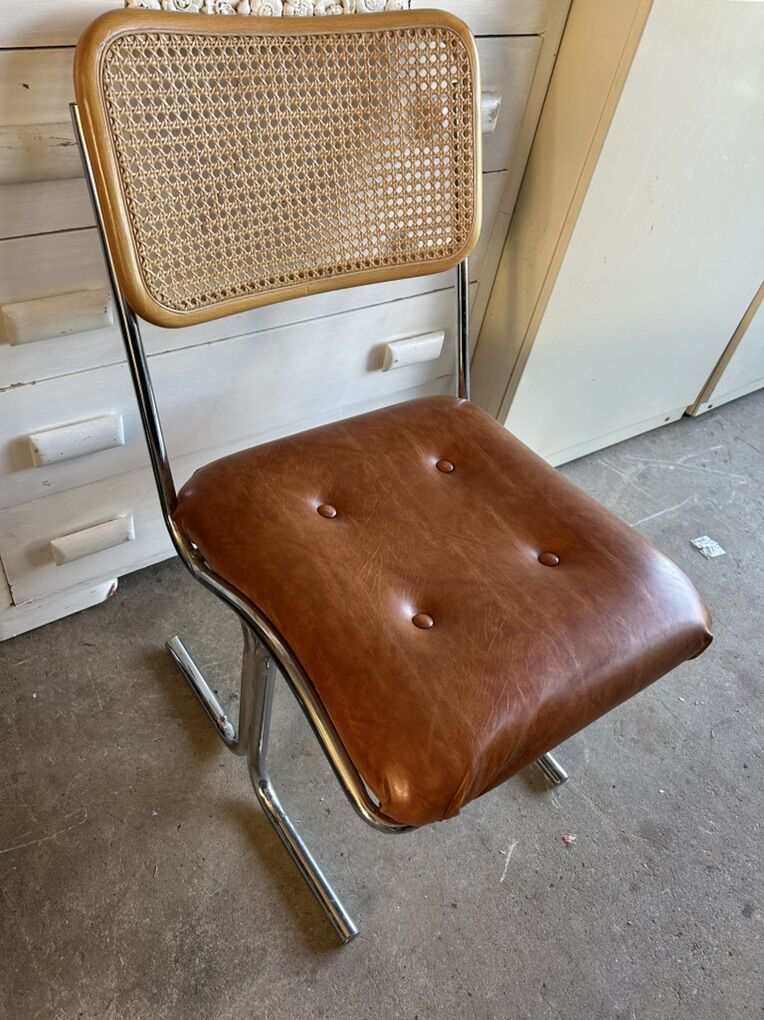 VenmoThese are harder to find these days, Mid Century Modern Cal-Style or Retro Chrome and Brown Naugahyde Side Chairs. These were made in Italy in 1976, they are the Marcel Breuer Francesca style looking dining chairs composed out of steel tubular structure, chromium-plated. Lot of 6 identical chairs, no table. The back rest I believe is natural cane and stained beech edge and has the rattan looks, the seat features an upholstered polyurethane faux leather. One seat has some fading in spots and one button on one chair had pushed through but overall in great condition for the age. Some light surface rust on the bottom below the seat, see pictures. Make me an offer. Cash or Venmo only.