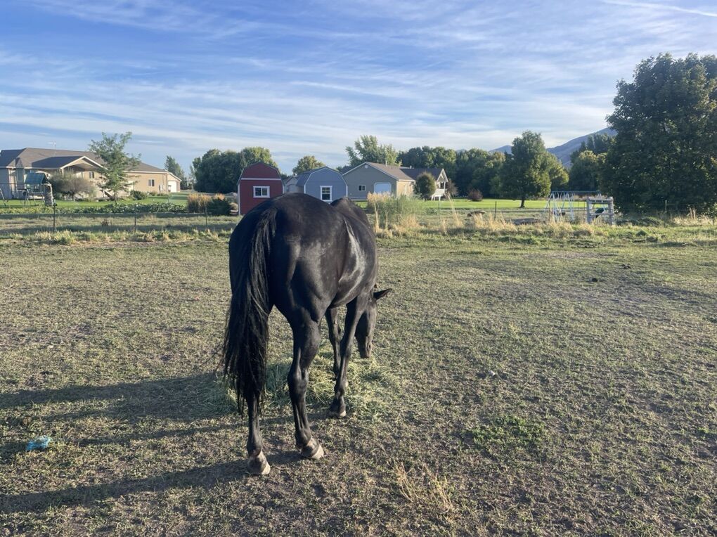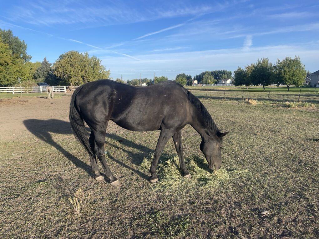 ApplePay-16hh black quarter horse mare -15 years old -great to handle -been used ranching, trail riding, 4-H, hunting -great with flags, parades, rodeos etc… -used for lessons with young riders and grandkids -has minor arthritis and ring bone in front left foot so we give her a dose of bute when using. -a good farrier can help with the issues.