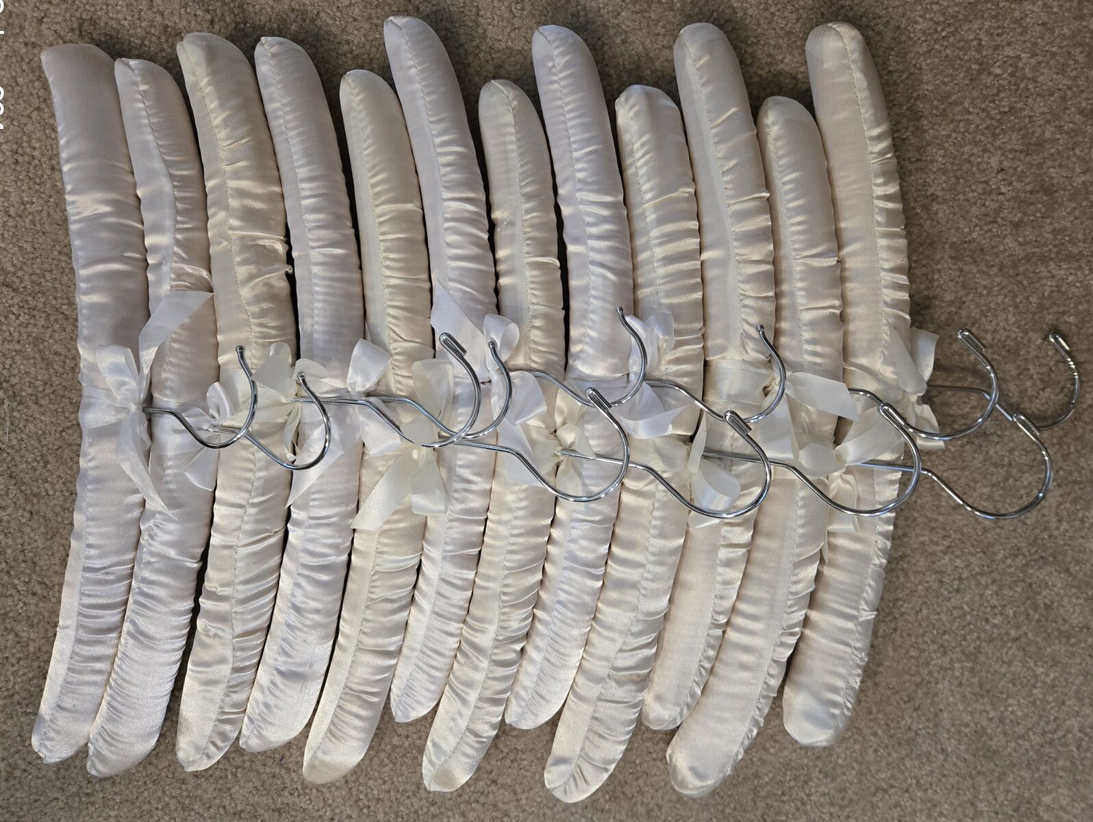 Gently Used, 12 Vintage Satin Or Fabric Padded Lingerie Clothing Boudoir Hangers White CreamSmoke and Pet Free Home Used for Boutique Props, Hanging & DisplayingClothing