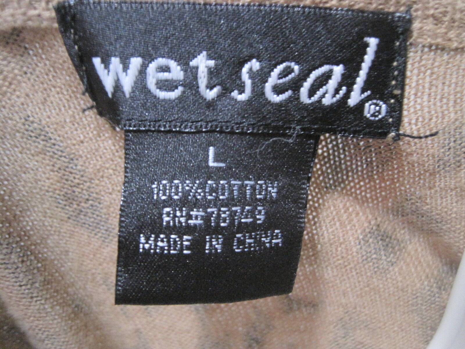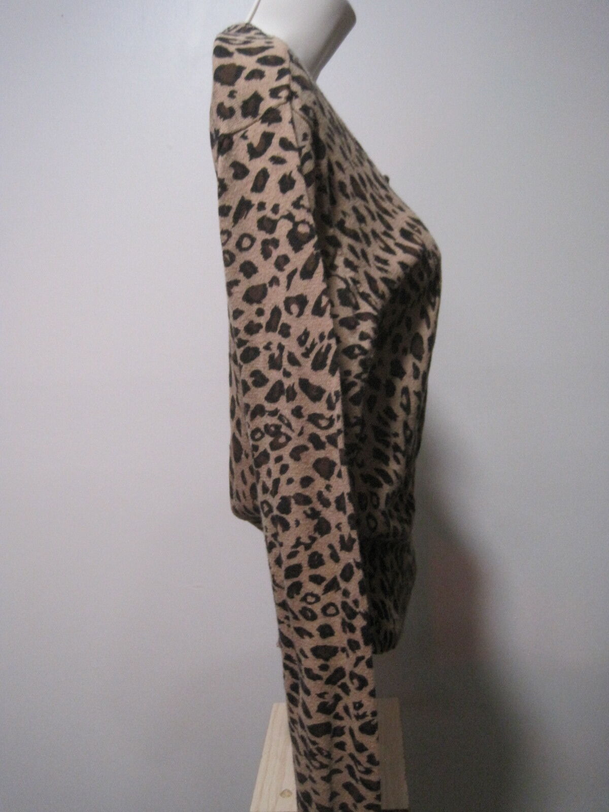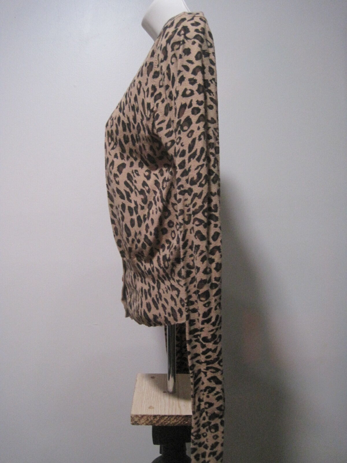 The Wet Seal Long Sleeve Leopard Animal Print Button Up Shirt Sweater Women in size Large is a stylish and versatile top perfect for various occasions. Made from 100% cotton, this shirt features a scoop neck, button closure, and a regular fit. The beige color and leopard print theme add a trendy touch, while the long sleeves and casual sleeve type make it comfortable for winter, fall, and spring seasons. Easy to care for with machine washable instructions, this button-up shirt is a great addition to any woman's wardrobe for a fashionable and unique look.