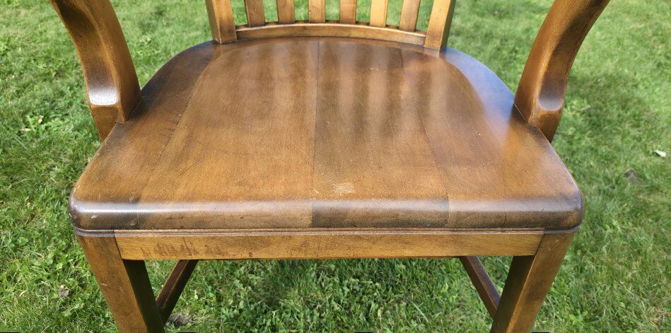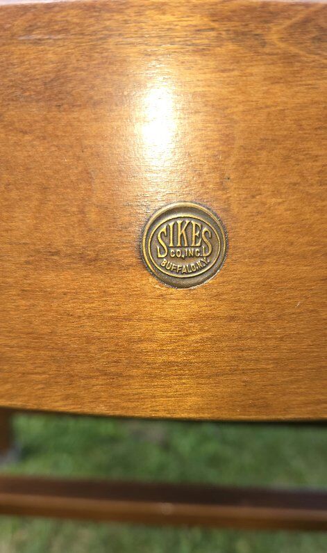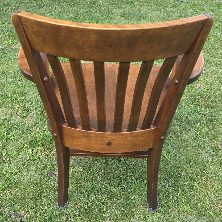 Vintage Traditional Mahogany Library Bankers Office Arm Chair by Sikes. A Traditional Mahogany Library Bankers Office Arm Chair by Sikes Brothers, c.1940. This Bankers Chair would look exceptional while displayed in an array of library styles. The solid mahogany shows a drastic grain throughout, accompanied by a deep original satin finish. This finish pairs nicely with many styles from different periods, perfect for staging. The slat back adds a timeless flare to the overall design, along with sculpted arm rests. The backside of the Chair shows the original Sikes Brothers brass label. See all photos, text message is better, see my other adds, thank you.