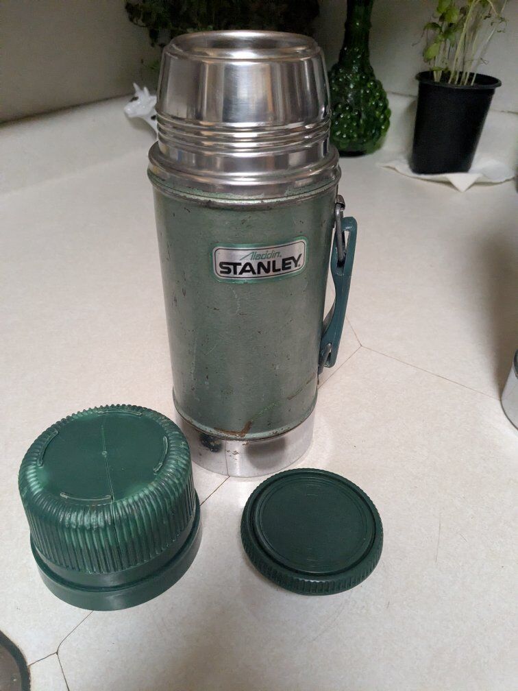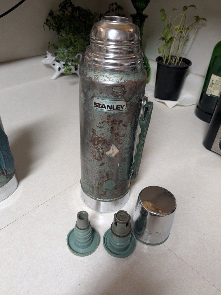 I have 2 vintage Stanley thermos'.Both have been well used and you can tell from the outside but the inside is still great and still keeps liquid without leaking and also keeps it very hot or very cold for a very long time. The seals on the lids are still really good. My dad used these everyday for work when I was a kid. These things are amazing. No wonder they are so expensive. Asking $20 each or make me an offer for both. Message or text with any questions.