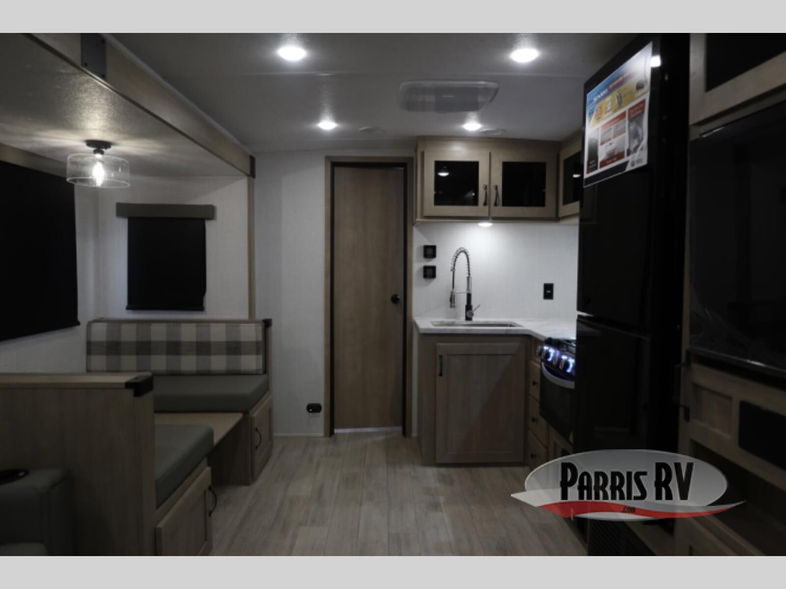 Whether you are looking for a bunkhouse, a private bedroom, or dual entry doors in your next RV, this one might just be the perfect fit with all those features! There are 45" x 72" bunk beds, each with their own wardrobe and their own private entry door, making it perfect for camping with older kids. The galley kitchen offers amenities such as a microwave, cooktop, an 11 cu. ft. refrigerator, and an L-shaped counter for preparing and serving meals. You will also find more storage, an entertainment center and a slide out sofa sleeper and booth dinette that offer more sleeping space when needed.