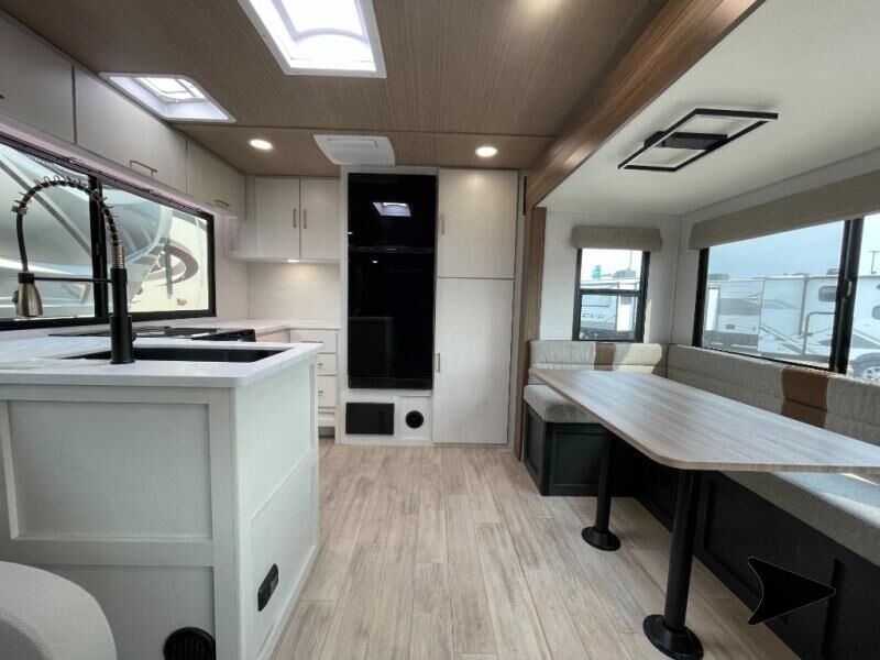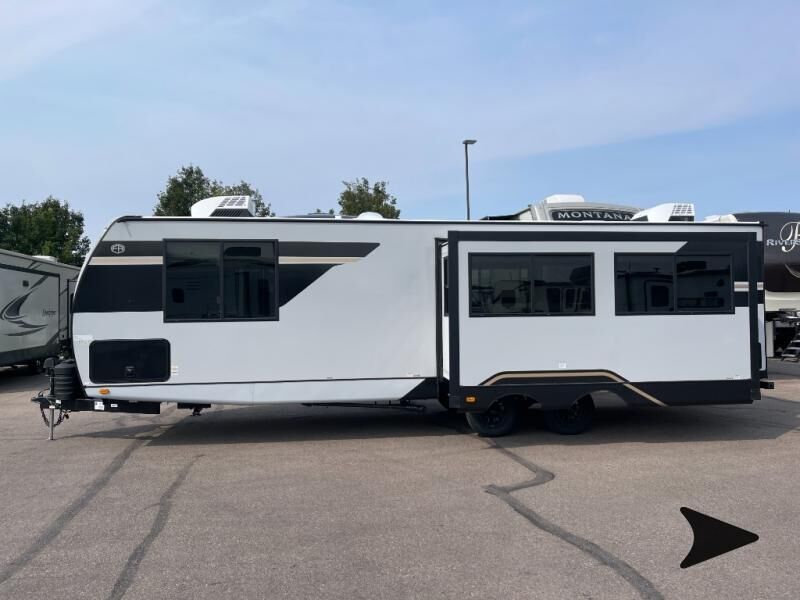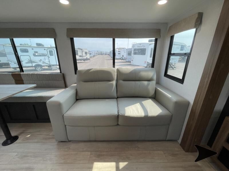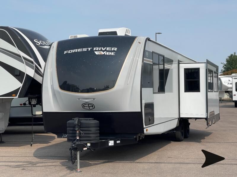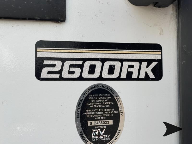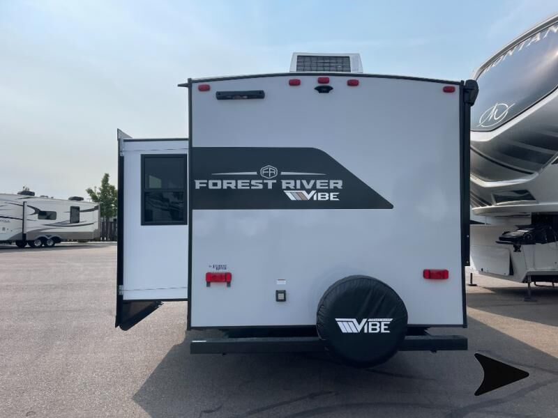 Forest River Vibe travel trailer 2600RK highlights: Rear Kitchen Two Recliners Private Bedroom Panoramic Windows Escape to the great outdoors in this Vibe travel trailer. Once you arrive at your campsite, set up the 20' electric awning with LED lights, then grab the fishing poles from the large pass-through storage. You can make lunch on the electric oven/air fryer, and your food can be stored in the 12V refrigerator. The spacious full bath includes a 36" x 30" walk-in shower to clean up every day, and there is a linen closet to store clean towels and necessities. With any Vibe travel trailer by Forest River, you will enjoy comfort at every turn! There is a Norco huck-bolted steel frame, an enclosed underbelly with 12V heating pads, and a PVC roof membrane for added durability. You will also find a universal docking station outside, along with slam latch doors, European style square windows, and an automotive painted front cap. Head inside to enjoy the premium residential-style furniture, decorative window treatments, privacy shades in the living room and bedroom, and many more comforts!