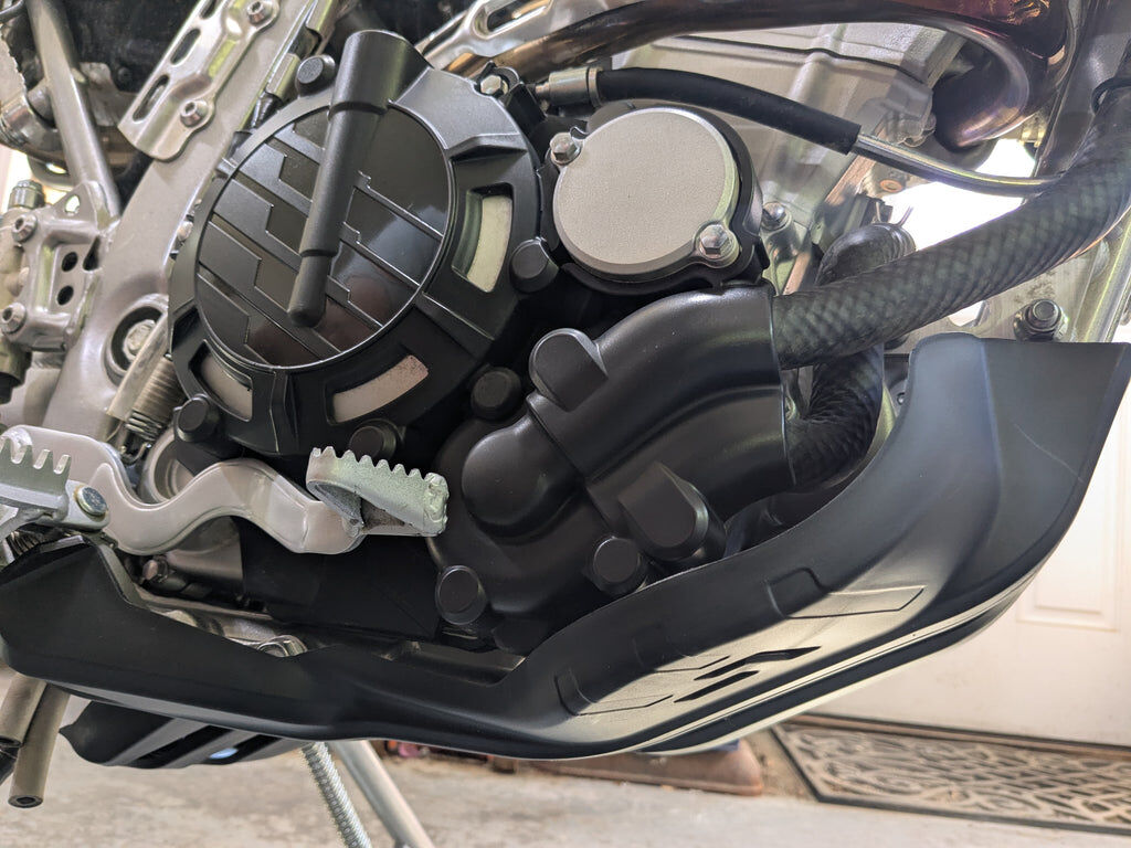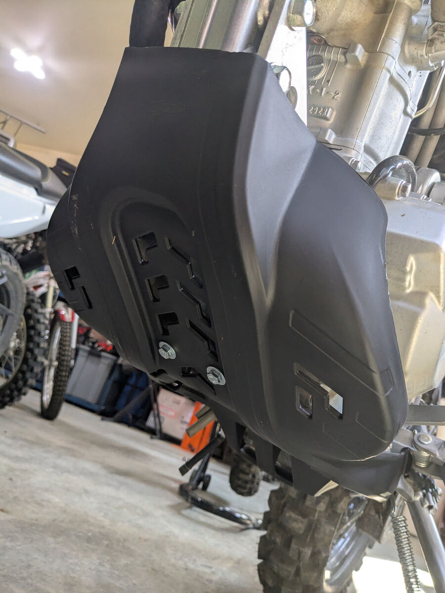 Many Benefits: Much lighter than aluminum or steel, weighing only 1.3 lbs. and averages 4mm thick Durable plus slides easily over obstacles Doesn't reflect engine noise, offering a very quiet ride with amazing protection Doesn't affect frame rigidity like aluminum or steel skid plates do - better handling Provides great coverage of the underside of motor cases All mounting hardware provided - as shown in gallery Protects the rear suspension linkage too
