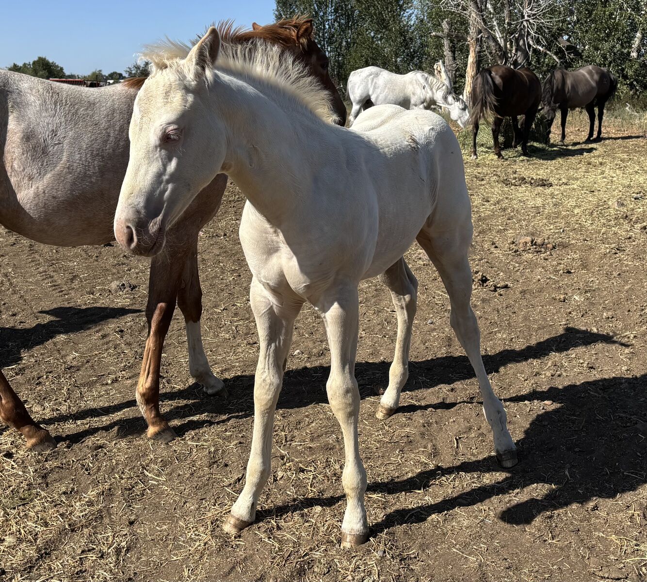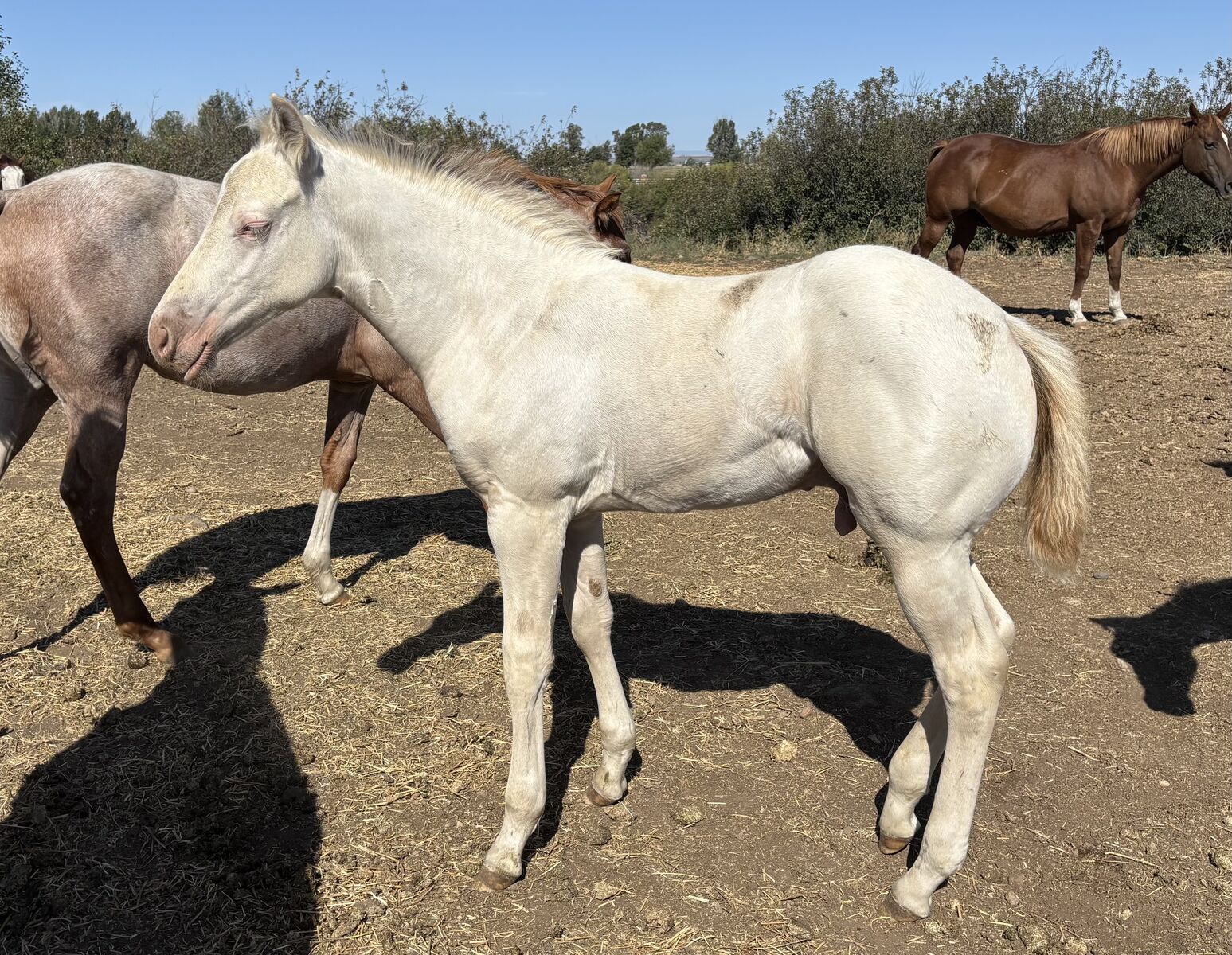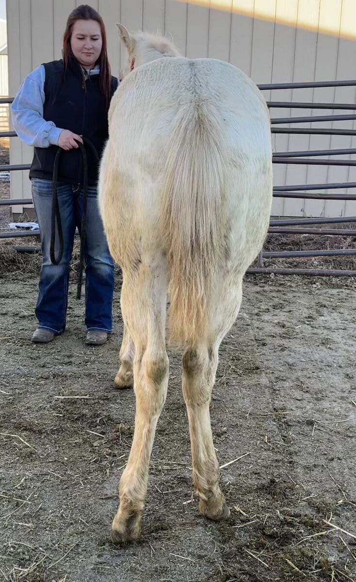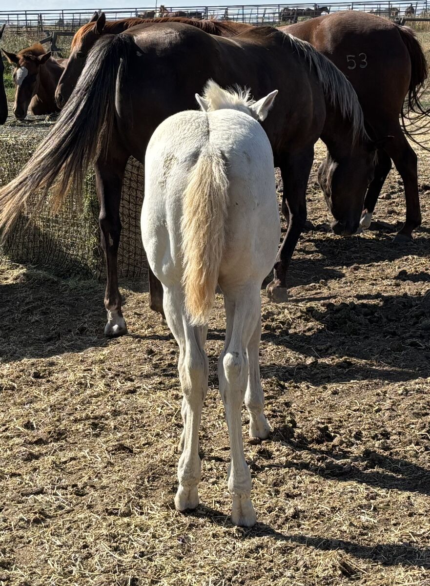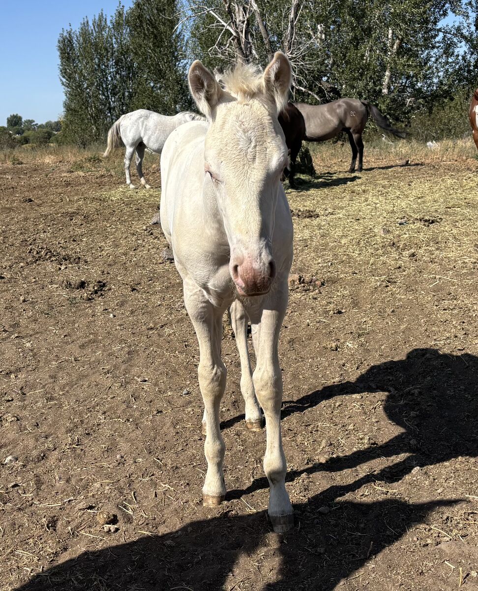 “Casper” is an AQHA cremello dun colt born June 20, 2025. He is out of our AQHA mare Golden Pecos Peppy and by the stud Flying Prince Dun It. He comes from bloodlines packed full of reining, cowhorse, and ranch working horses. His mom is a palomino mare, and his dad is a grullo. If he is kept as a stud, he will be a color producer! We believe he may be dun (he has not been color tested), and he carries two cream genes, so you are guaranteed a cream based foal. These include, palomino, buckskin, or smoky black depending on what color mare he is paired with.