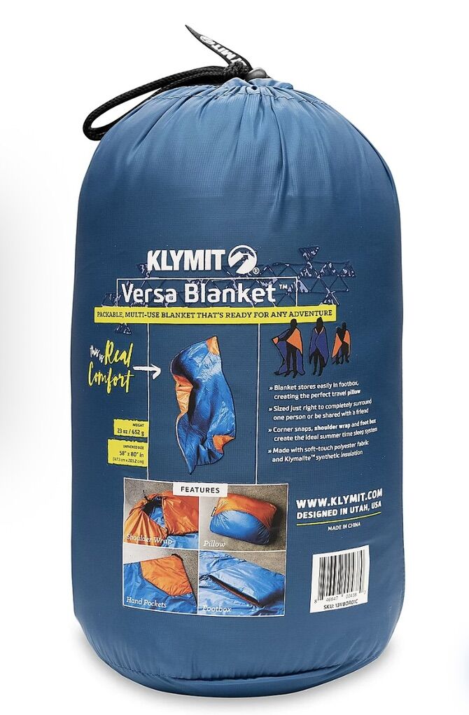 VenmoBorn in the back country of the Wasatch Mountains, Klymit has been challenging the conventional approach to outdoor gear since 2007 based in Kaysville, Utah. Our passion is spending time outdoors with the people you care about. It is perfect for camping, picnics, sporting events, and more. Weigh 23 ounces the versa blanket stores easily in the front Box, creating the perfect travel pillow. 58 x 80“ blanket, the versa can completely surround one person where we shared with a friend. Corner snaps, a inch cord on one and the foot box on the other create the sleep system. Built with 20D soft touch, polyester and Klymite synthetic loft insulation.
