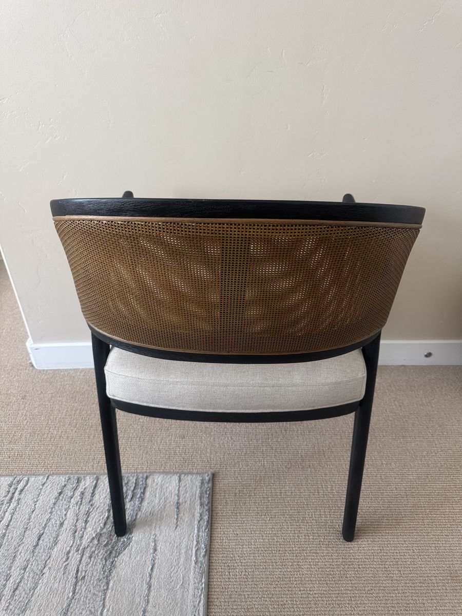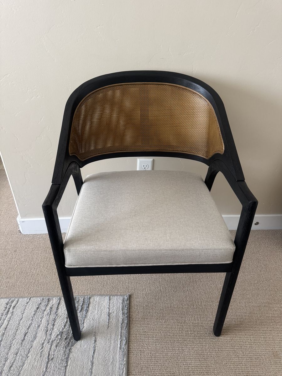Feel the quality with this Aimee Dining Room Accent Arm Chair that features a beautifully designed softly curved back and elegant rattan caning, blending classic.