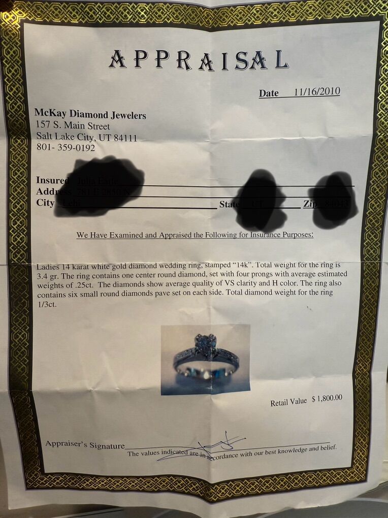 If you’re interested, we will meet at a jewelry store in Murray to have them confirm the authenticity of the ring. You can have my copy of the appraisal, but I will remove my name and address first.
