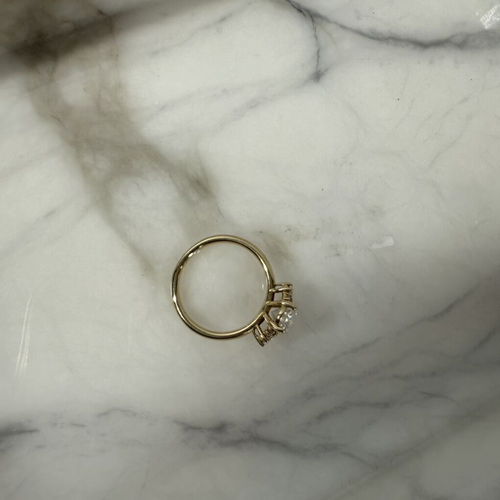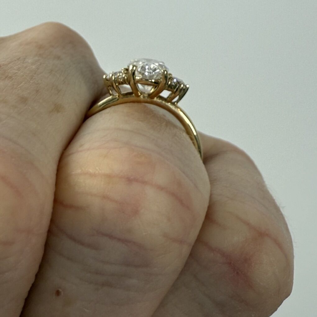Each side of the center stone has a 3-stone cluster. Never used for the engagement/proposal since we decided on a different ring.