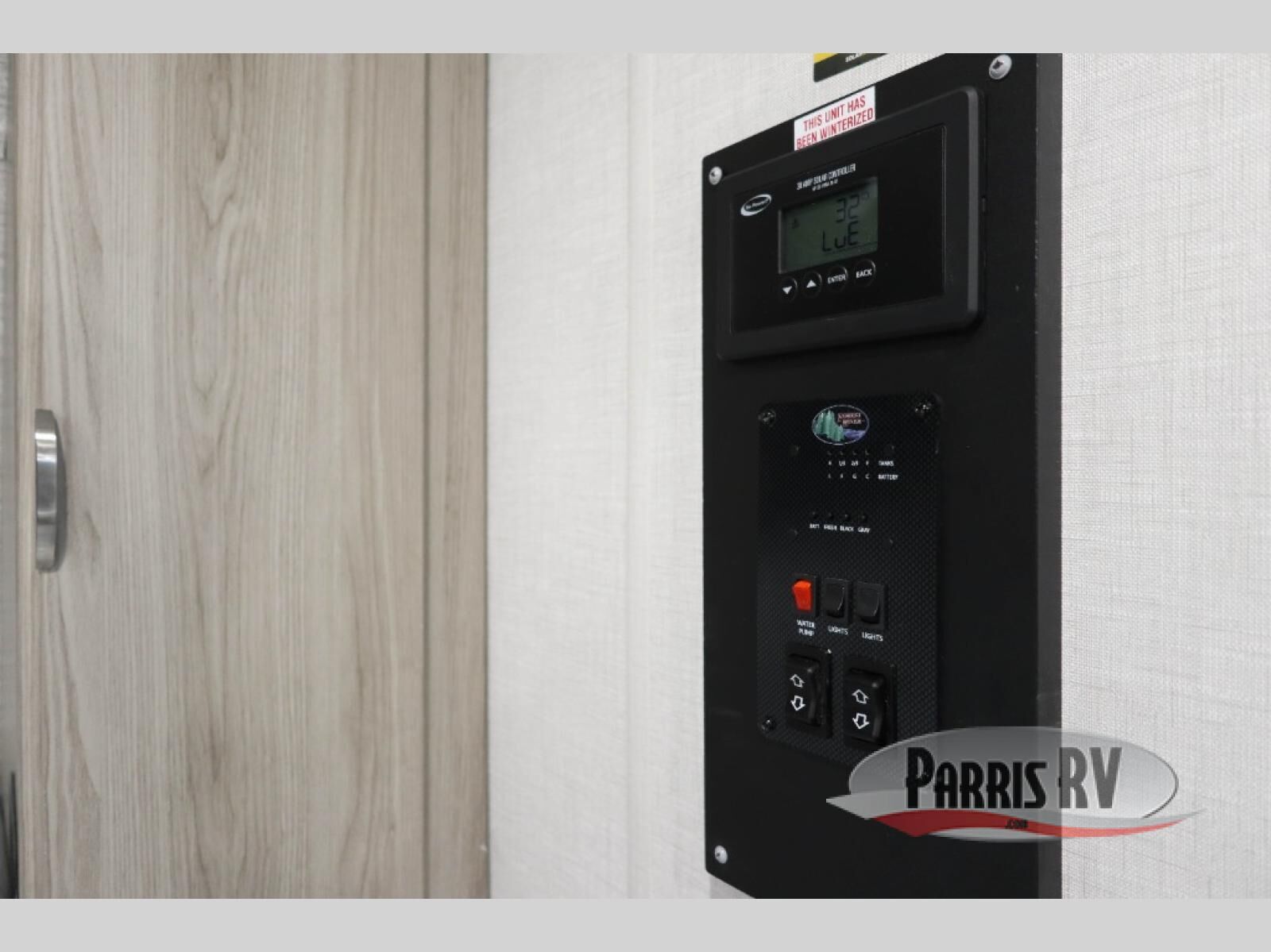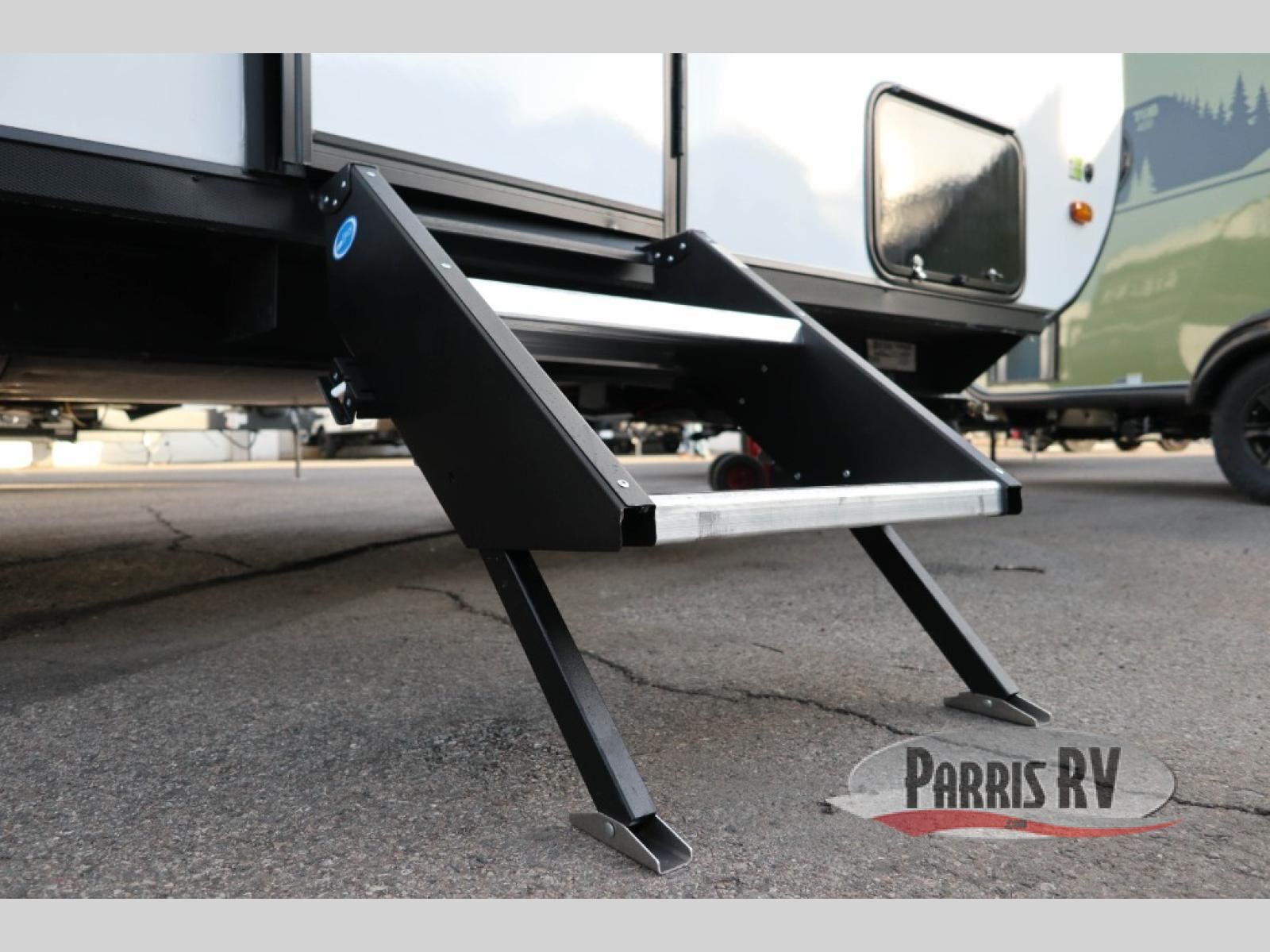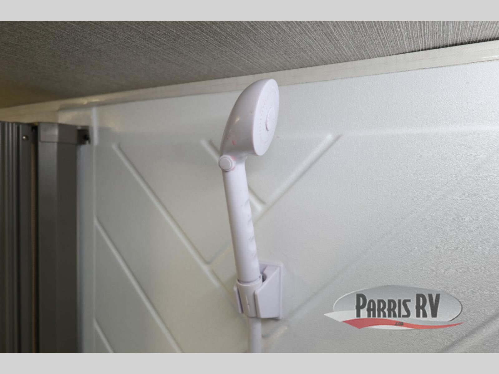 Perfect for your family, this single slide with split bunk and queen bed provides your family comfortable sleeping for four, and the slide adds a bit more interior space in camp. The split bunk is located behind the spice rack door and TV for your entertainment and cooking needs. Speaking of cooking, you can prepare your best home cooked meals with the cooktop, and store any leftovers in the dual swinging 12V refrigerator. Relax each night in the theater seating and freshen up in the rear corner bathroom each morning which features a skylight over the shower for more natural lighting.
